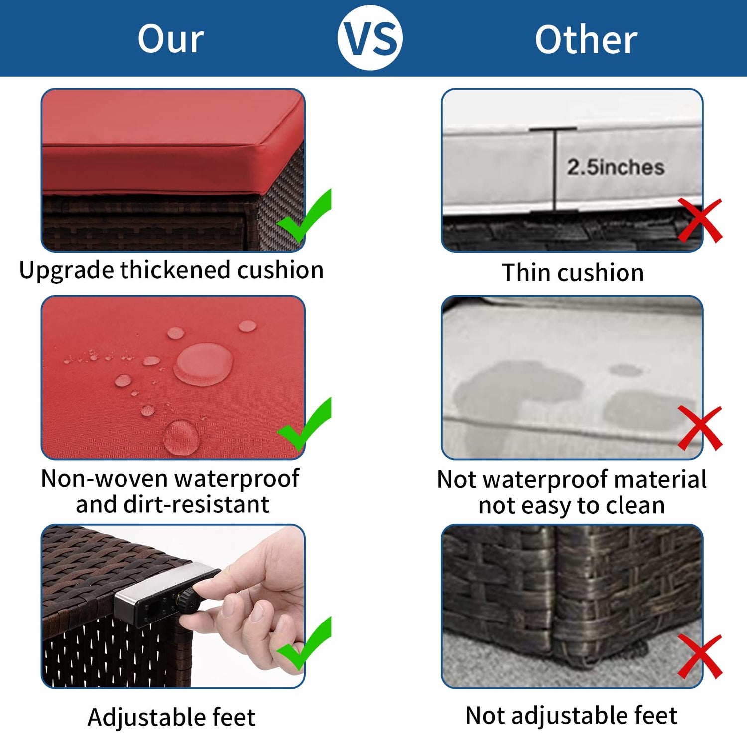 - 【LONG-TERM USING】The inner structure of outdoor table and chair are made of solid steel, there is Strong and not easy to rust, and the outdoor patio set for Backyard Porch is so sturdy that every single patio couch can hold up to 350 pounds. The fabric of the Patio Conversation Set is made of polyester fiber, which does not fade or pills, and looks new even after long-term using. The outdoor sectional furniture is made of synthetic PE resin wicker, So that the patio conversation set can remain intact in any harsh environment, providing a full-scale experience.