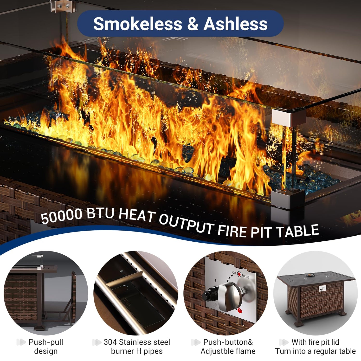 - 🍇【CSA CERTIFICATION FIRE PIT】🍇Our smokeless fire pit has the CSA certification. It’s made of propane material to ensure your safety during using. The Patio Furniture Set with propane Fire Pit, it could provide a spacious space for at least 7 people to enjoy a smokeless and ashless outdoor experience. The fire pit is equipped with 304 stainless steel h-burner, colored flint and tempered glass, which not only can have colored flame, but also can ensure the stable output of flame.