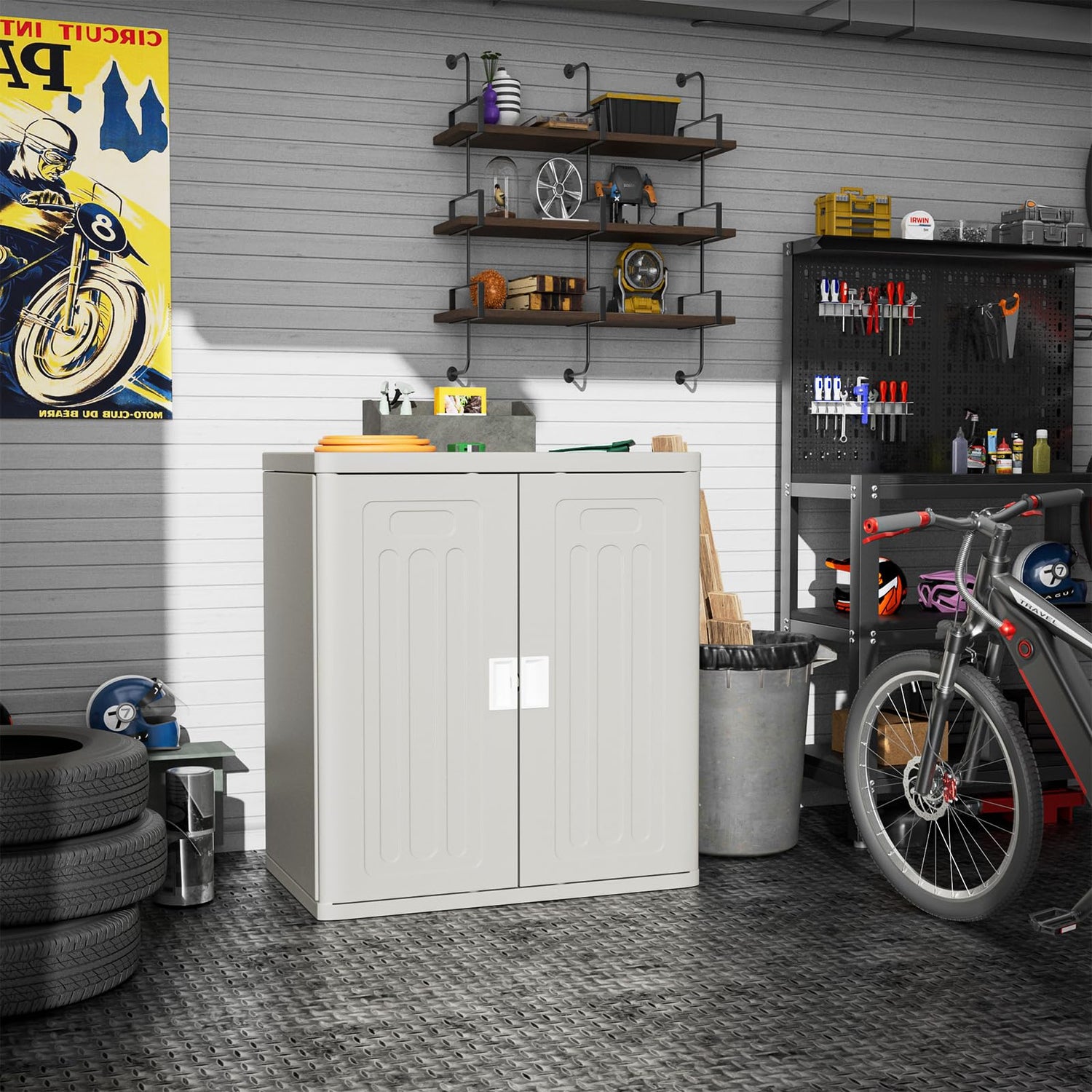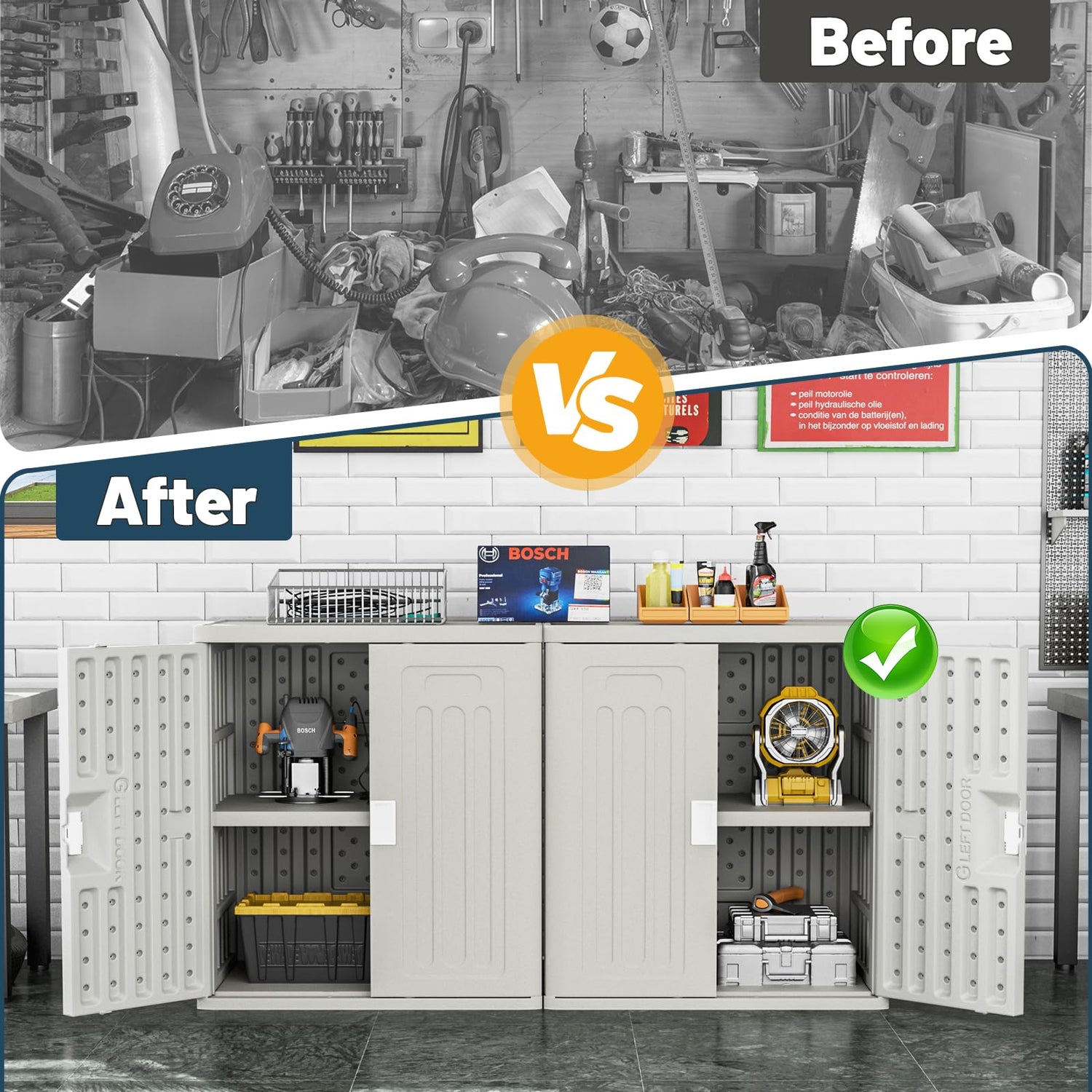 - OUTDOOR STORAGE CABINET: Give your garage tools, cleaning supplies or other tools room to be stored for a neat and organized living space! This plastic storage cabinet suitable for all kinds of occasions: indoor, outdoor,balcony, yard, garden, etc.
