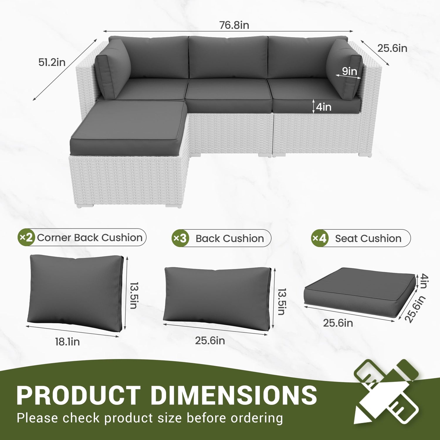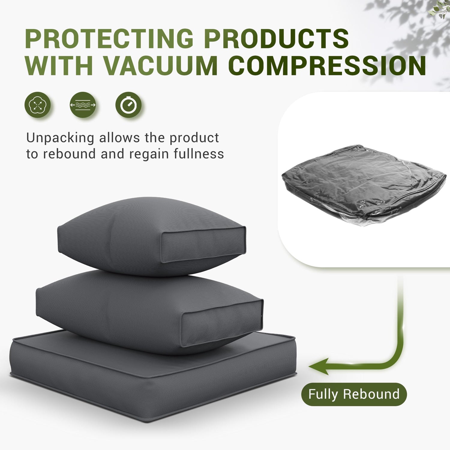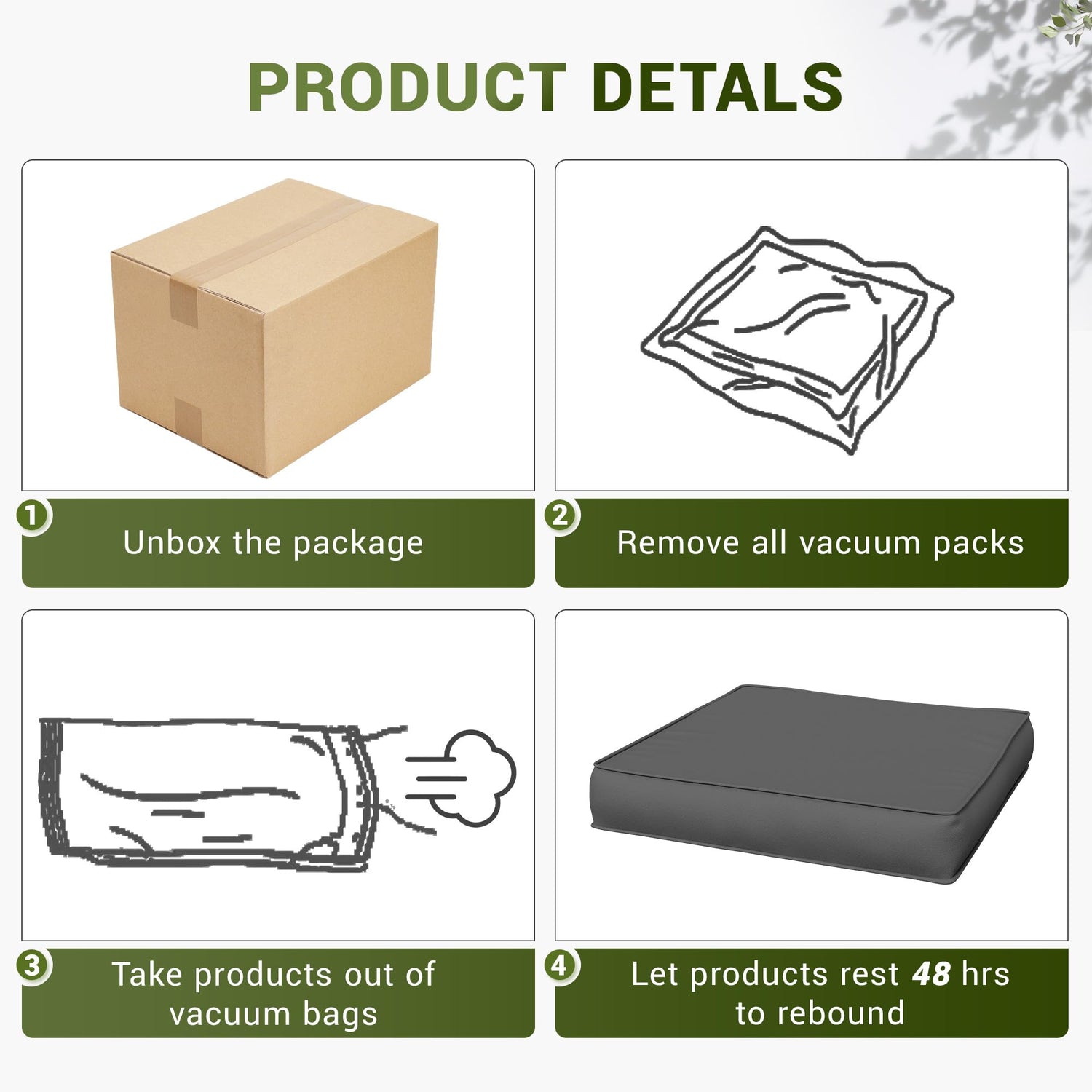- 【PRODUCT INCLUDES】: The 9-piece outdoor cushion set includes 4 seat cushions(25.6" L x 25.6" W x 4" H), 3 Back Cushion(25.6" L x 13.5" W) and 2 Corner Back Cushion(18.1" L x 13.5" W), please measure the size carefully before purchasing. All cushions are vacuum-packed, they will gradually return to original state some time after opening.