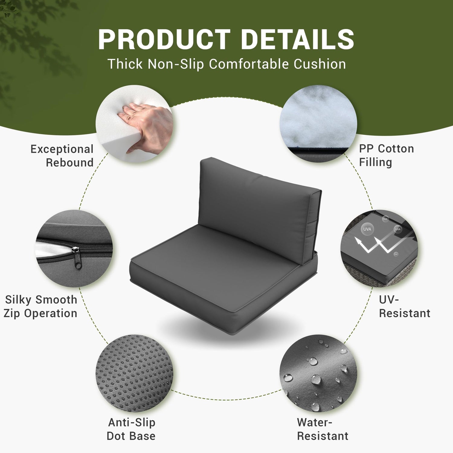 - 【4" THICK OUTDOOR CUSHIONS】: Experience superior comfort with our 4-inch thick, premium outdoor cushions seat, crafted from 28D high-density sponge for enhanced softness and support. The backrest pillows are generously filled with PP cotton, offering a plush and cozy feel that ensures a delightful user experience.