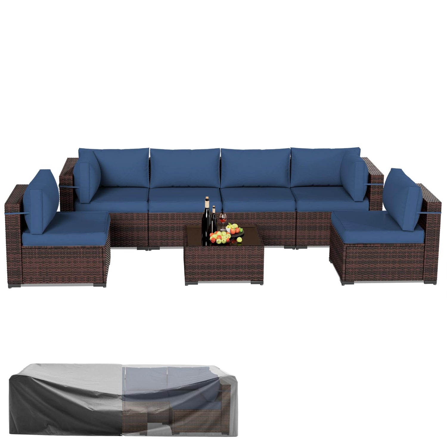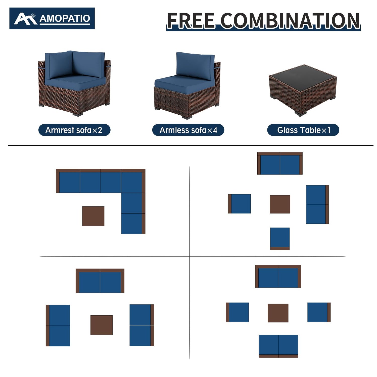 Amopatio Patio Furniture Set 7 Pieces Patio Conversation Set Outdoor Sectional Wicker Rattan Sofa with All-Weather Cover, Patio Furniture with Pillows Fits Porch Garden Backyard Balcony (Navy)