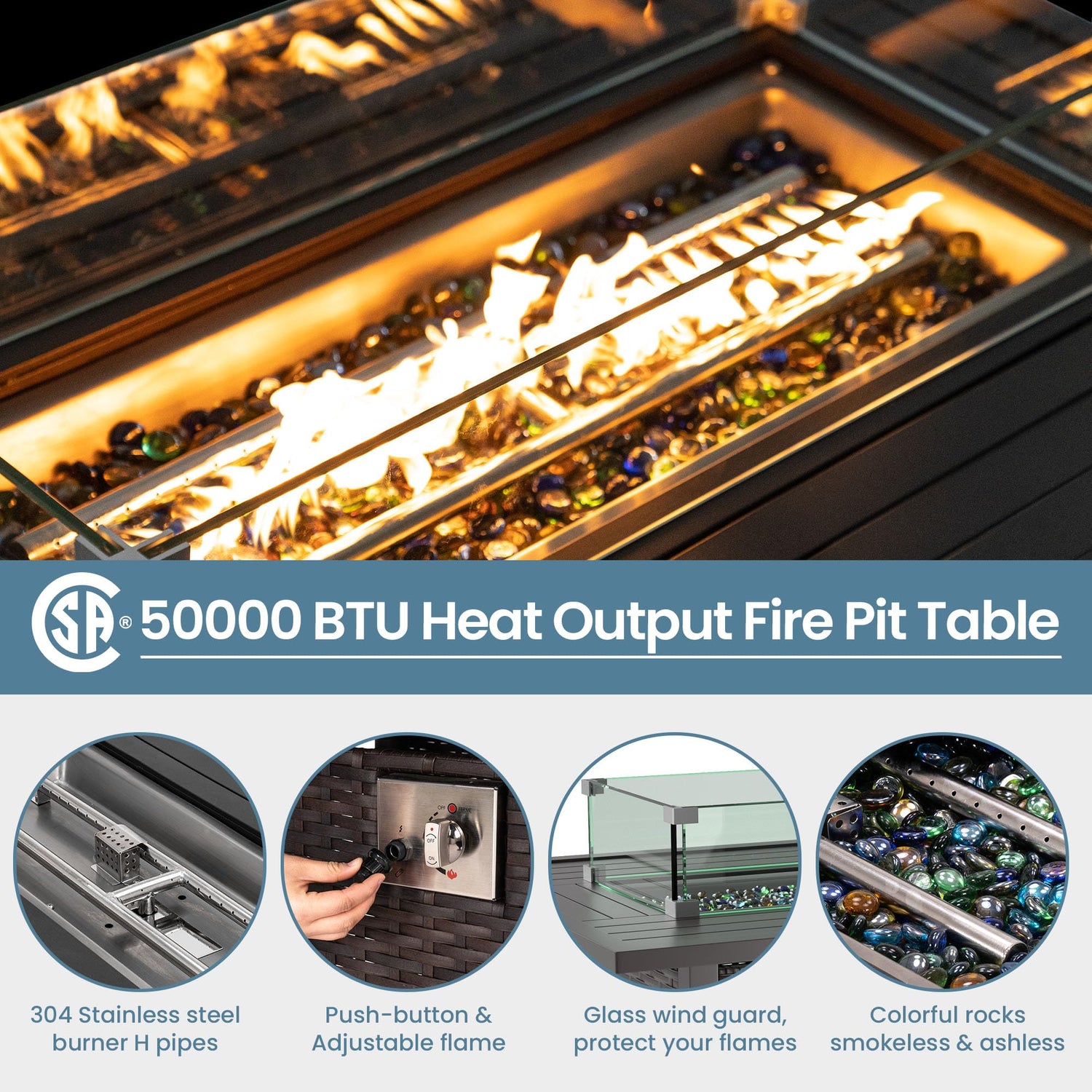 - 【CSA CERTIFICATION FIRE PIT】The patio furniture set with propane fire pit, it could provide a spacious space for at least 7 people to enjoy a smokeless and ashless outdoor experience. Tempered glass top for the coffee table, easy for wipe cleaning. The fire pit is equipped with 304 stainless steel h-burner, it can ensure the stable output of flame.