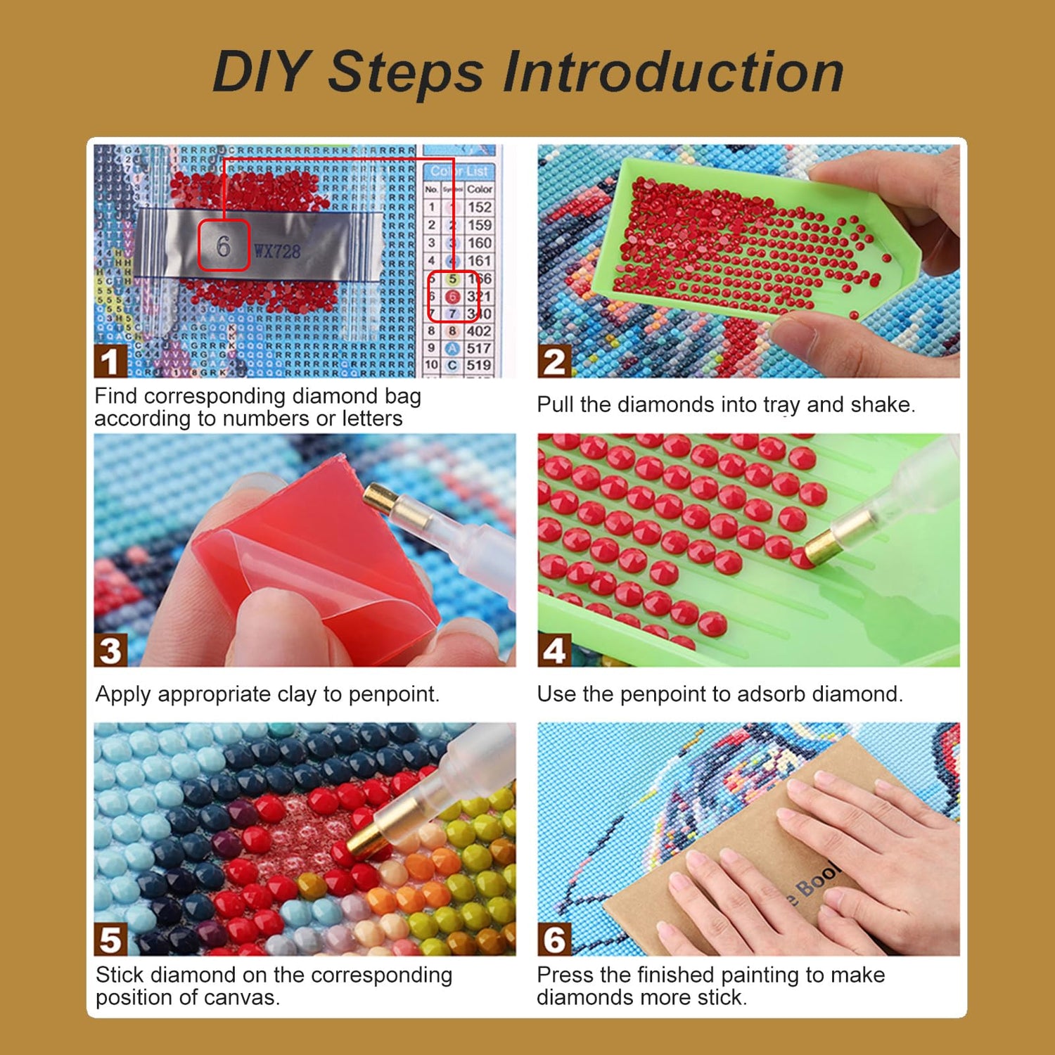 - 【Diamond Painting Size And Packaging】The diamond painting size is 30x30cm, including 1* high-definition canvas, 1* dot diamond pen, 1* cubic diamond tray, 1* red glue block, 1* pen cap. This set contains enough colorful round small diamonds and all the tools you need to make a diamond painting