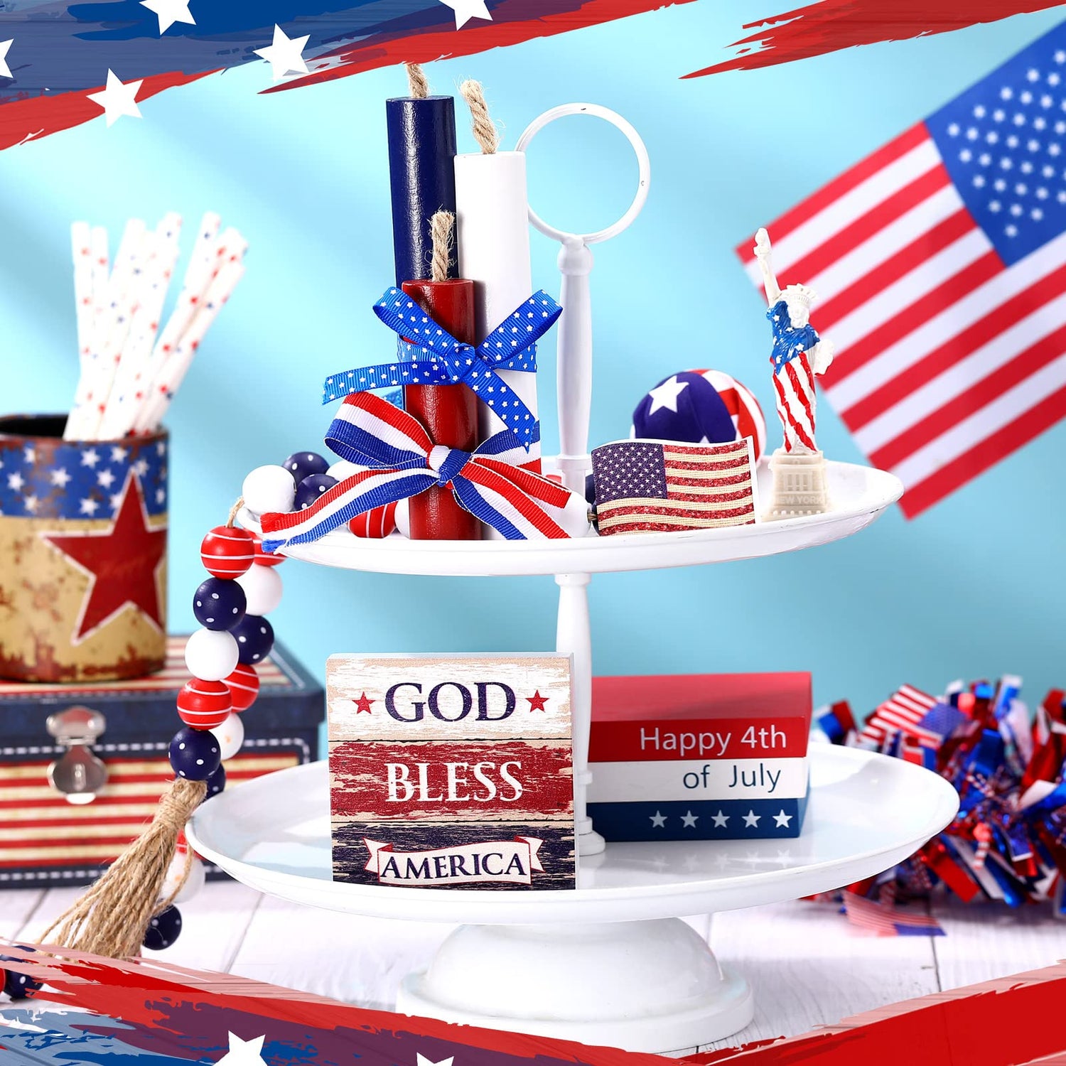 Amyhill 5 Pcs 4th of July Table Decorations Patriotic Table Centerpieces Rustic Independence Day Wood Firework Signs Tiered Tray Decor Rustic God Bless America Decor (American Flag)