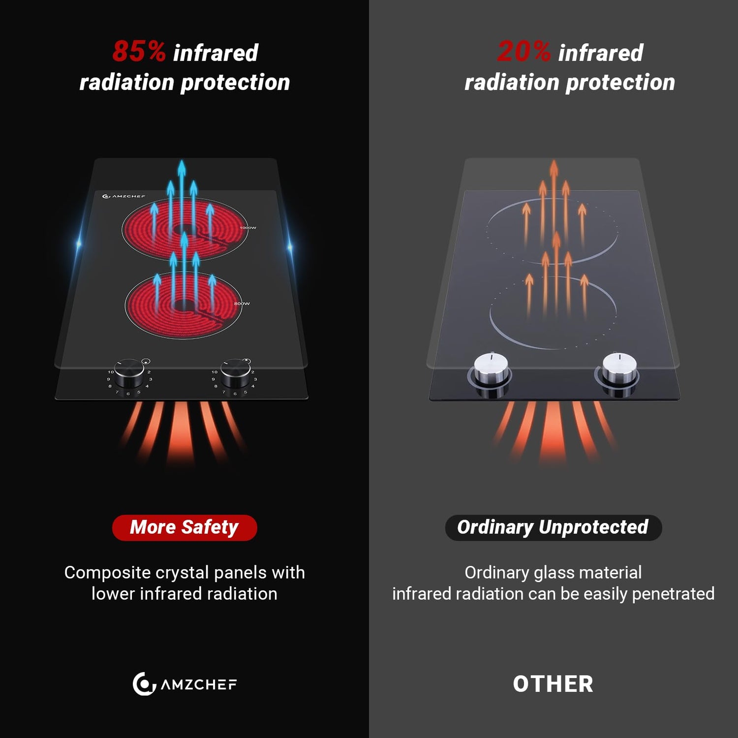- 【Compatible with most cookware】AMZCHEF 12 inch 2-burner electric stove is suitable for iron, stainless steel, casseroles, aluminium, copper, glass, skillets, ceramic pots and pans, etc. Whereas induction cooktops can only be used with magnetic cookware compared to induction cooktops. The electric ceramic hob offers greater convenience and more importantly, it does not emit electromagnetic radiation, ensuring safety and peace of mind for you and your family.
