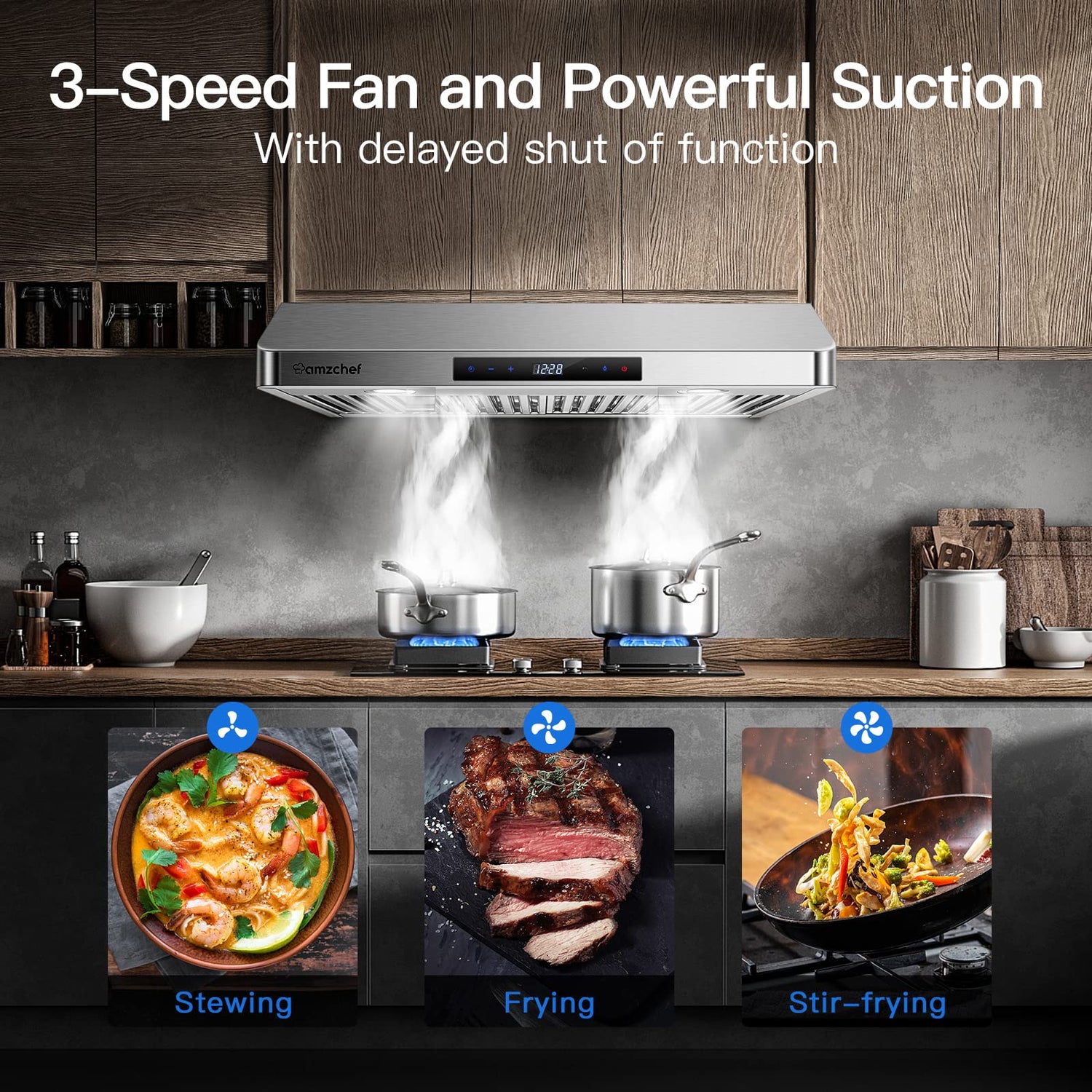 AMZCHEF Under Cabinet Range Hood 30 Inch, 700CFM Stainless Steel Kitchen Stove Vent Hood 3 Speed Exhaust Fan Touch/Remote/Gesture Control LED lights Time Setting Dishwasher-Safe Baffle Filters