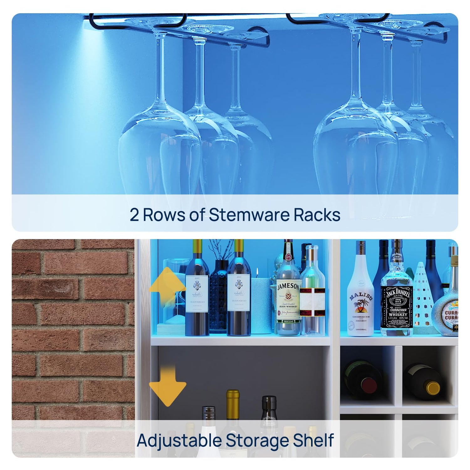 - 【Ample Storage Space】Powerful storage function, let your bartending space say goodbye to messy! The spacious tabletop can hold your coffee maker or shaker kits, two open compartments are perfect for storing stirring utensils and lighted decorations. The storage cabinet with wine racks and glass holders, which can holds 9 bottles of wine and hangs 6 wine glasses. The shelf on the left can be adjusted according to your needs to store different shapes of wine.