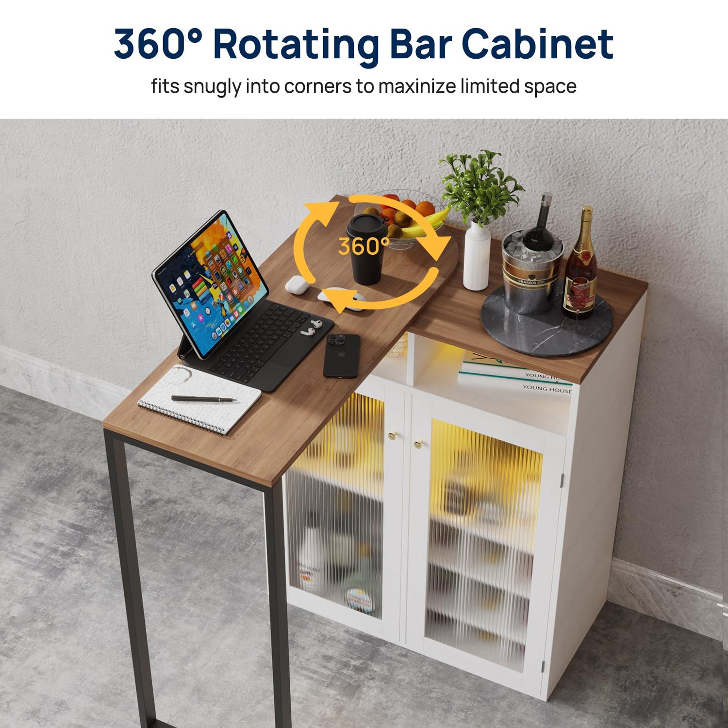 amzzar Wine Bar Cabinet with LED Lights, Small Liquor Cabinet for Home with Glass Holders and Wine Racks, Mini Home Bar with Power Outlet, Modern Rotating Coffee Bar Table for Office (White)