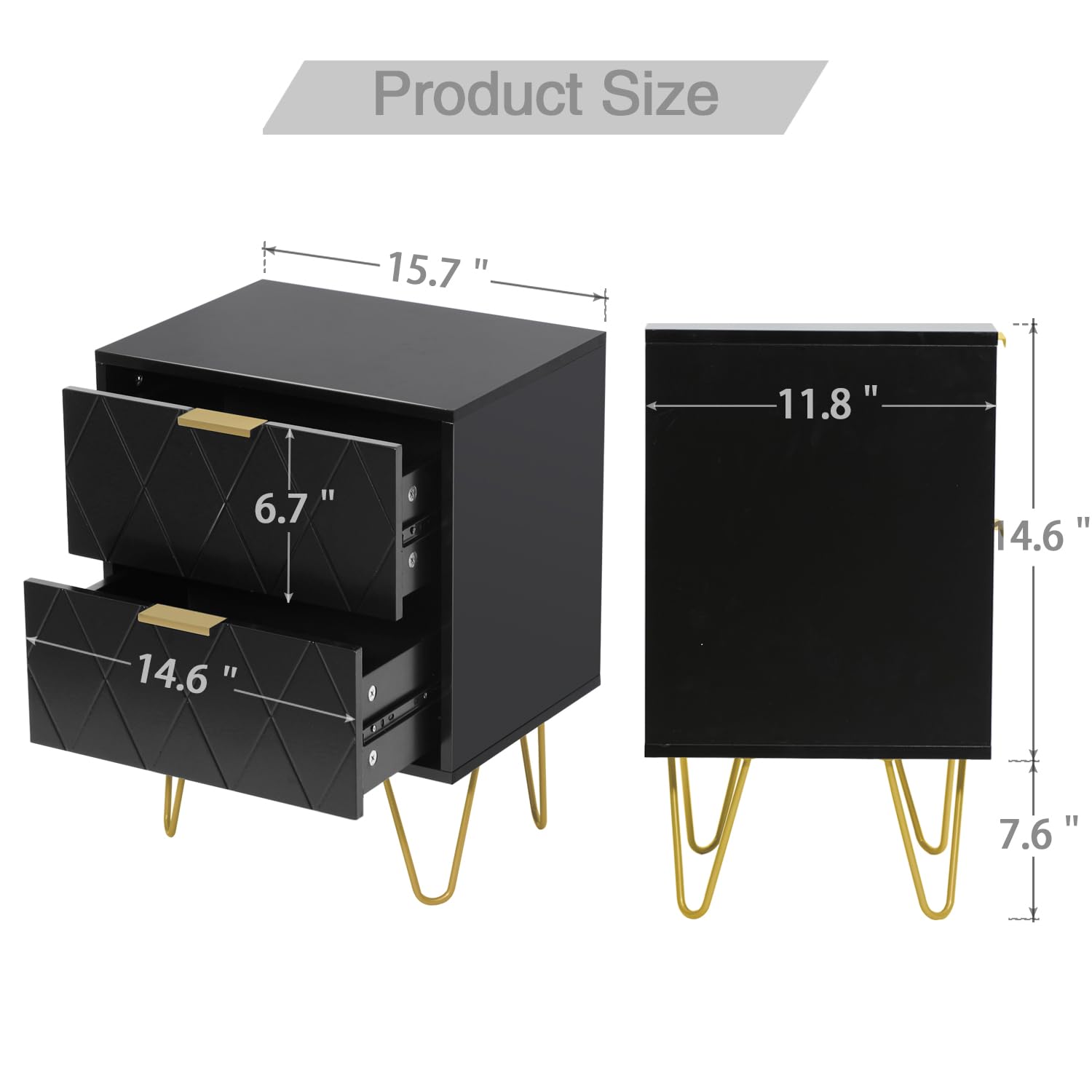 Anbuy Black Nightstand Set of 2 with Gold Handle, Bedside Table with 2 Drawers, Night Stands Set of 2 Gold Legs for Bedroom Living Room
