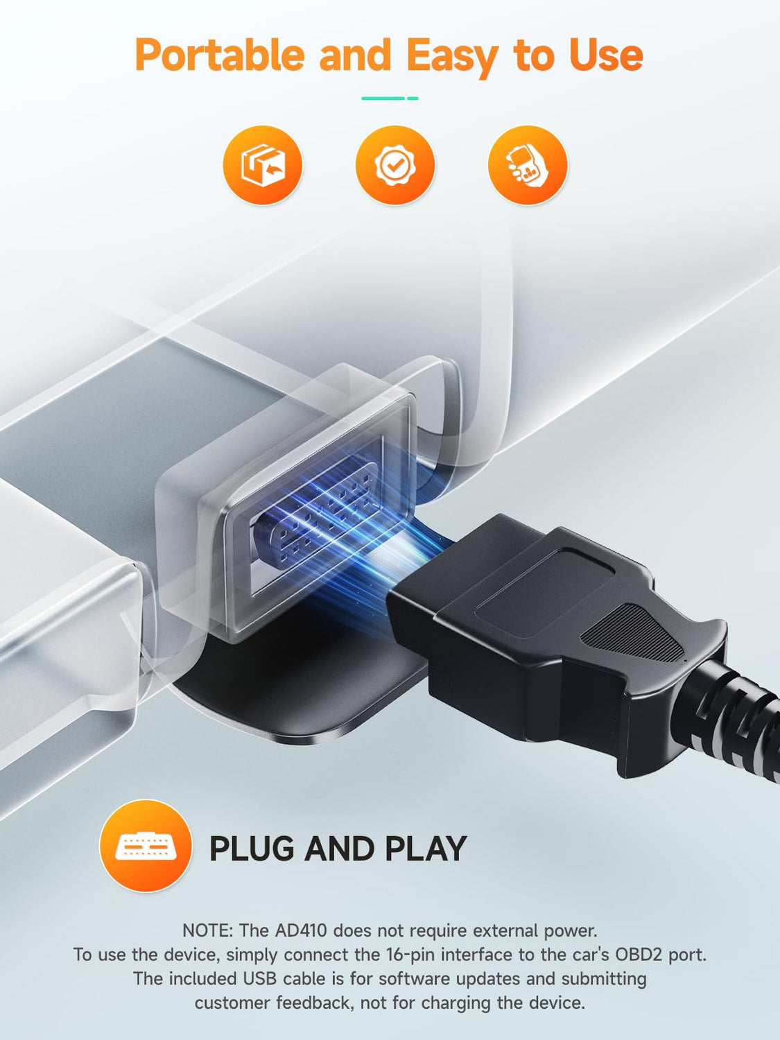 - At the bottom of the device, you’ll find a USB port. You can use this port to connect the USB cable that comes in the package. This connection is for updating the device’s software or sending feedback about any issues you might encounter. Just a heads-up: the USB cable is not meant for powering the device, and the ANCEL AD410 doesn’t need to be charged or plugged into a power source. Also, please make sure not to connect the USB port and the OBDII 16PIN port at the same time, as doing so can interfere with the device’s ability to diagnose problems.