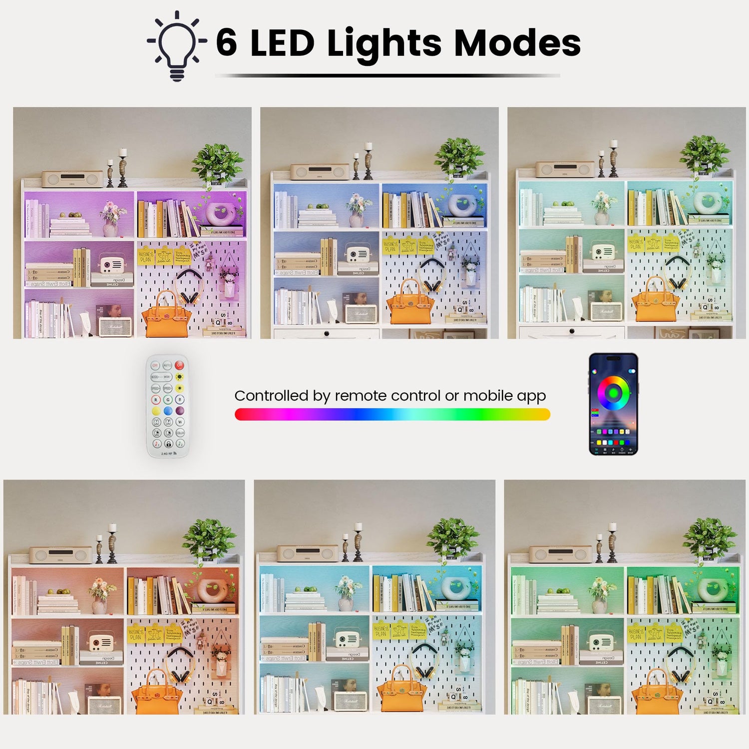 - 【Bookshelf with LED Lights】This bookshelf is equipped with LED light strips, you can easily adjust the six colors by mobile app or remote control, it is also very suitable at night, you can find the items you want without having to turn on the lights separately