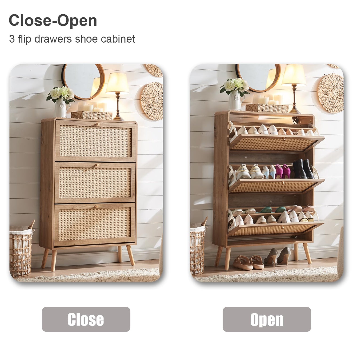 - 【Natural Rattan Design】This shoe cabinet is made of sturdy medium-density MDF and hand-woven natural rattan. The shoe storage cabinet looks more elegant and classic. The entryway shoe storage cabinet designed with ingenuity makes full use of space, making your living room, hallway, and entryway cleaner. The natural elements of rattan better decorate your home environment