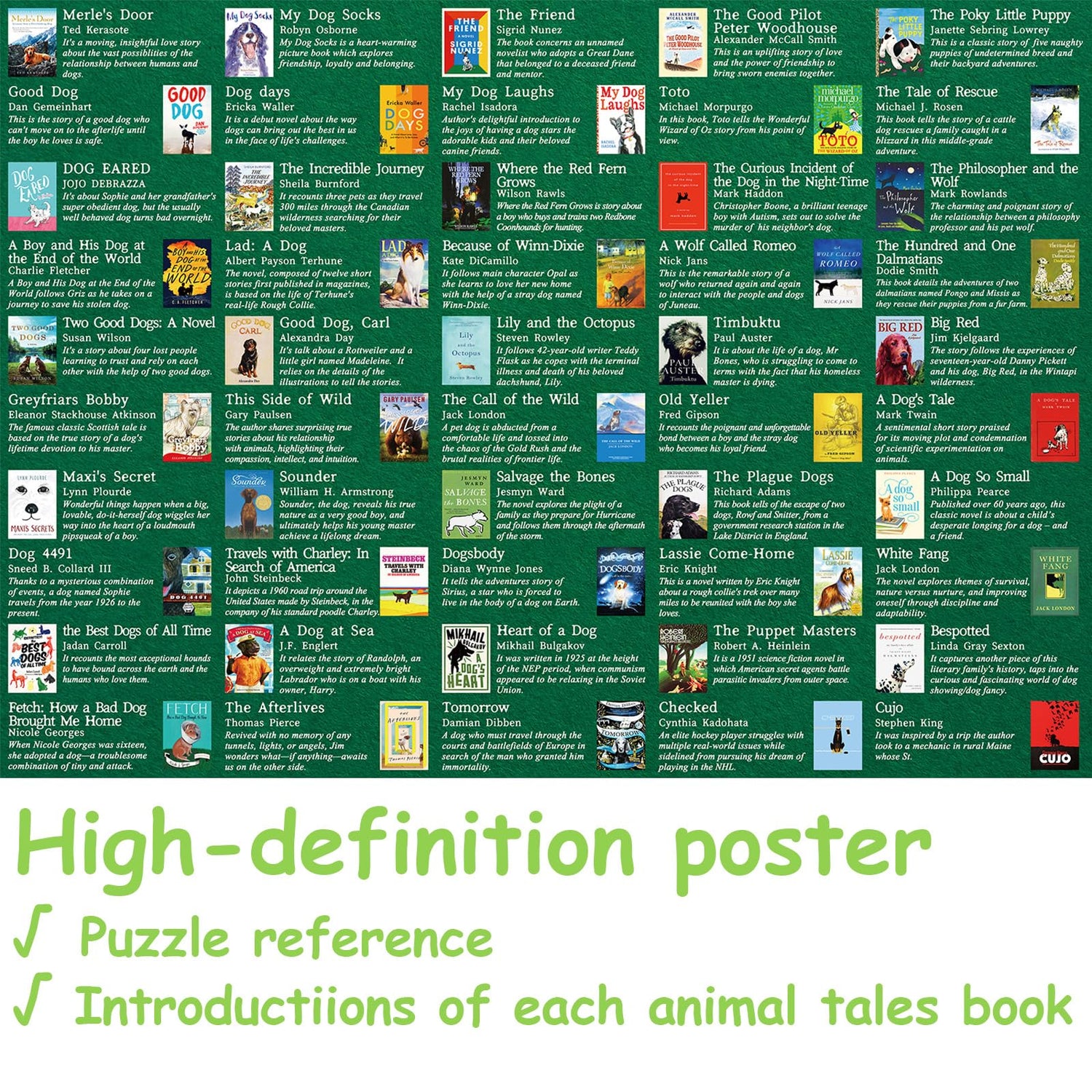 - ANIMAL STORY COLLECTION - This animal puzzle collects the covers of 50 classic novels related to animals that are worth reading. Each story tells the bond between humans and animals, or uses animals as a metaphor for people's inner world. Does the sheer emotion of animals touch your heart? If you like reading novels about animals, then you not miss this puzzle