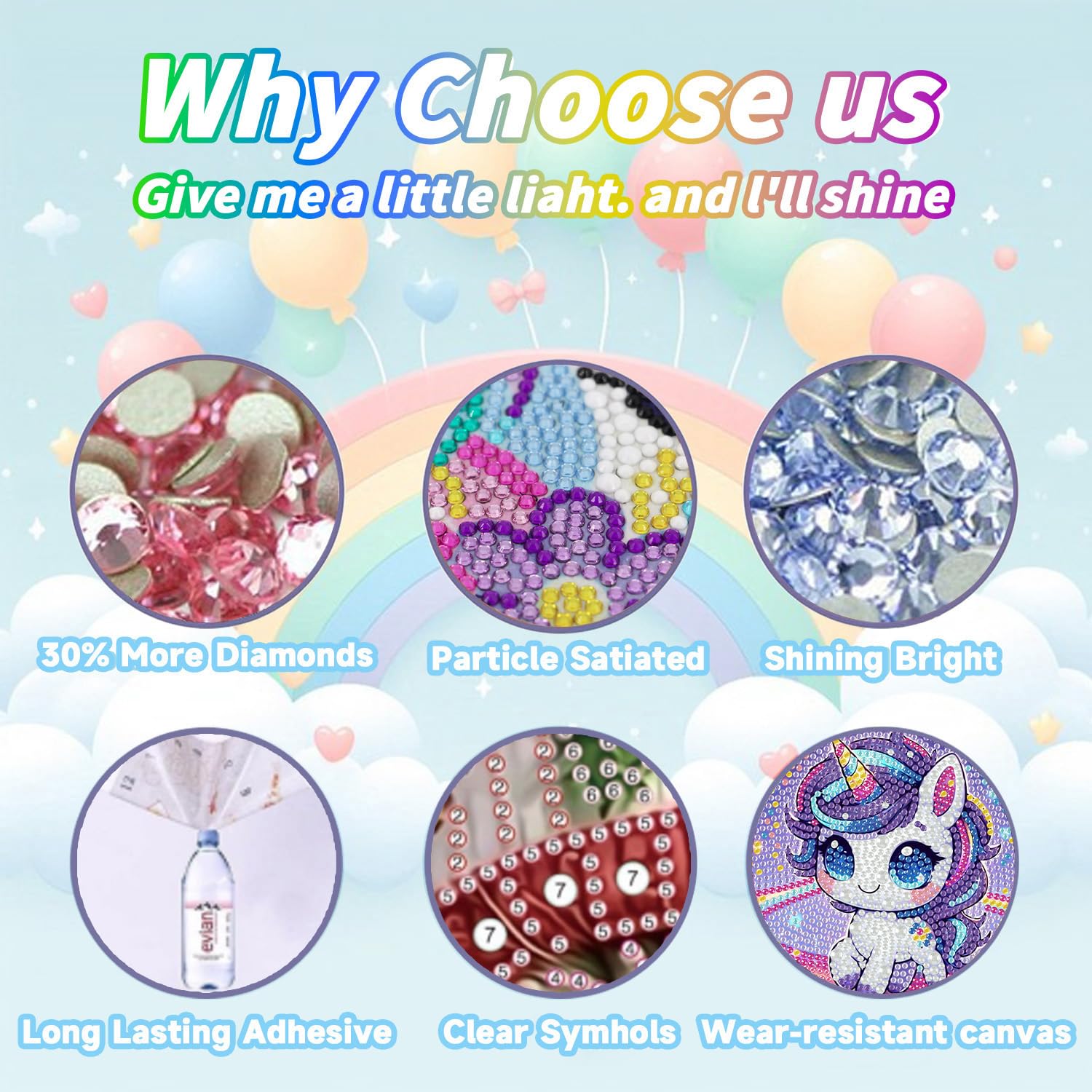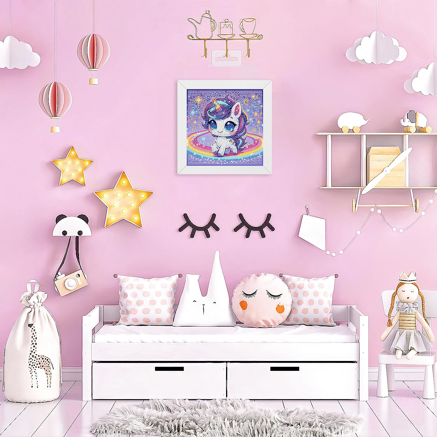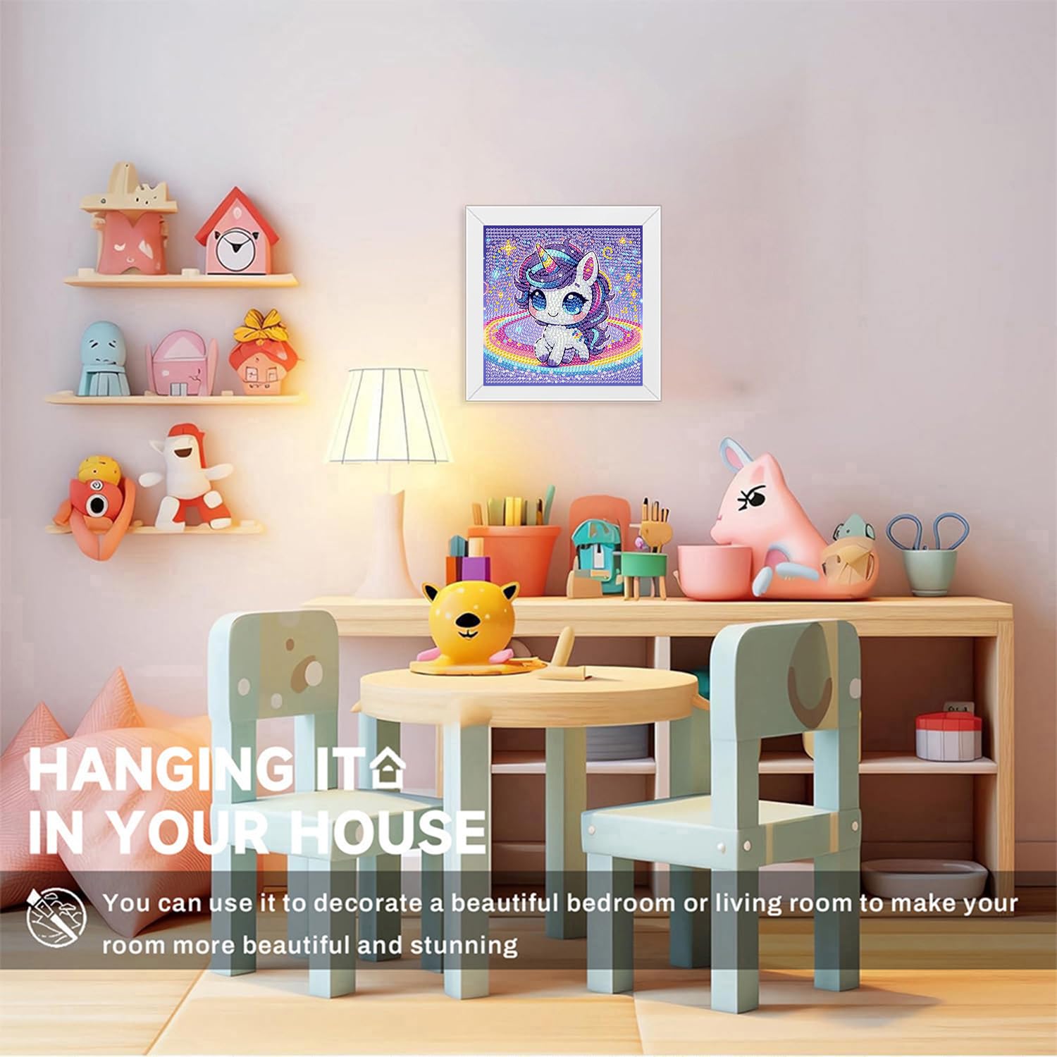 - 【Diamond Art Kits for Kids】You will receive a children's diamond art piece with a beautiful frame Every set comes fully equipped with a diamond art canvas, assorted crystal diamonds, painting frames, diamond art painting pen, a rhinestone tray, and specialized adhesive.The frame comes with a transparent protective film to ensure long-term preservation of the diamond art. Everything your child needs to complete their masterpiece is right inside the box—no additional purchases necessary.