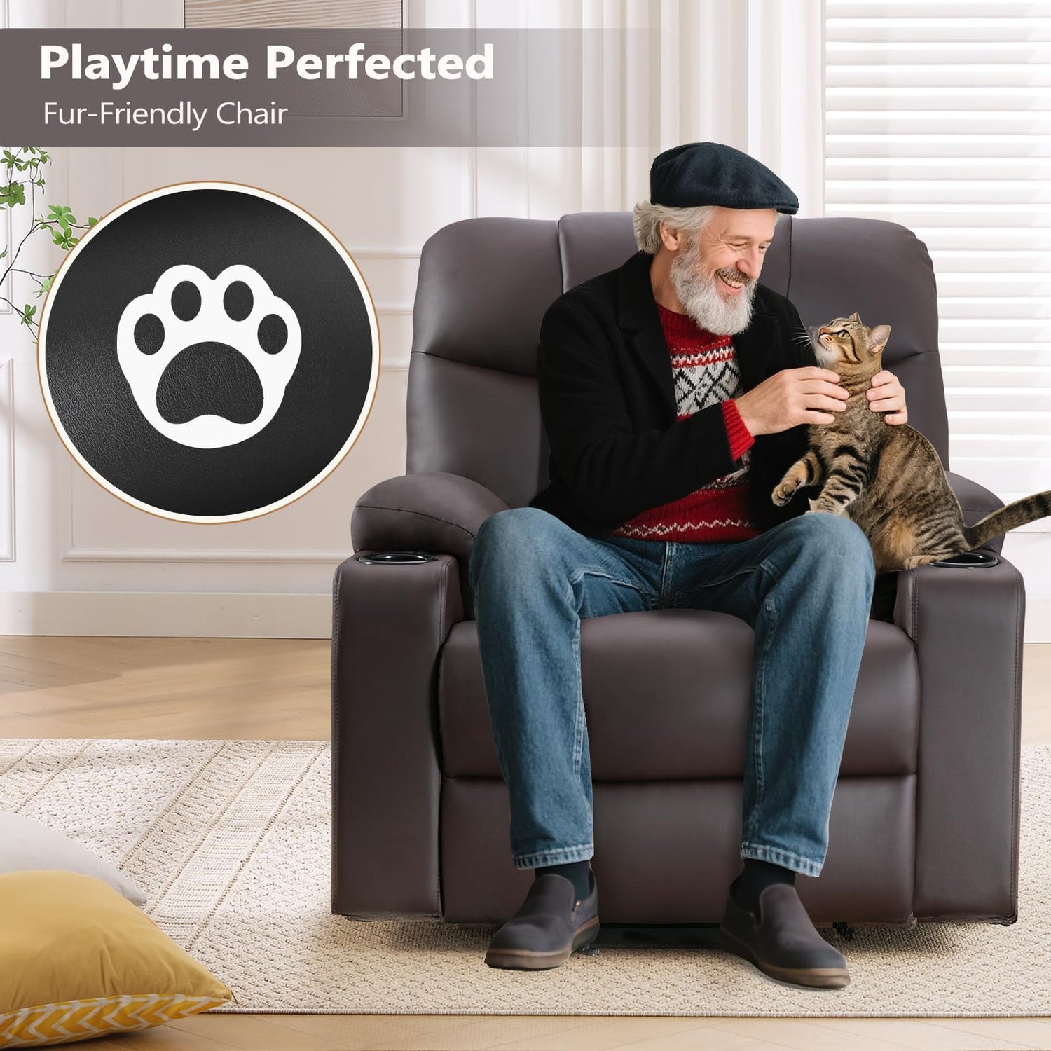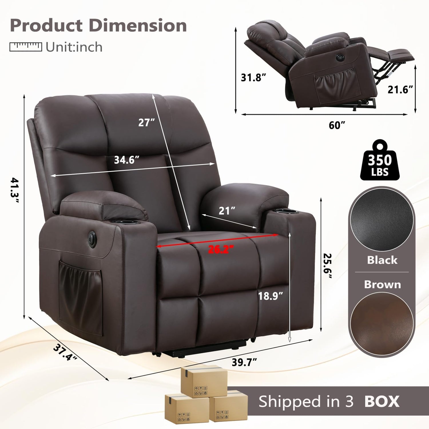 Details: The ANJ Brown Power Lift Recliner Chair for Elderly with Massage and Heat offers comfort, support, and independence. Wrapped in elegant brown faux leather, this electric recliner sofa is designed with a quiet motorized lift system to help seniors stand or recline easily. With 5 massage modes and waist heating, it soothes the waist, back, and thighs. Its ergonomic contours, plush padding, and breathable upholstery provide all-day comfort, while USB charging port, dual cup holders, and side pockets add modern convenience. Built with a heavy-duty steel frame, this recliner supports up to 350 lbs, making it reliable and durable. Perfect for living rooms, bedrooms, or home theaters, this ANJ brown massage lift recliner chair blends classic design with functional features. Shipped in 3 secure boxes for safe delivery.