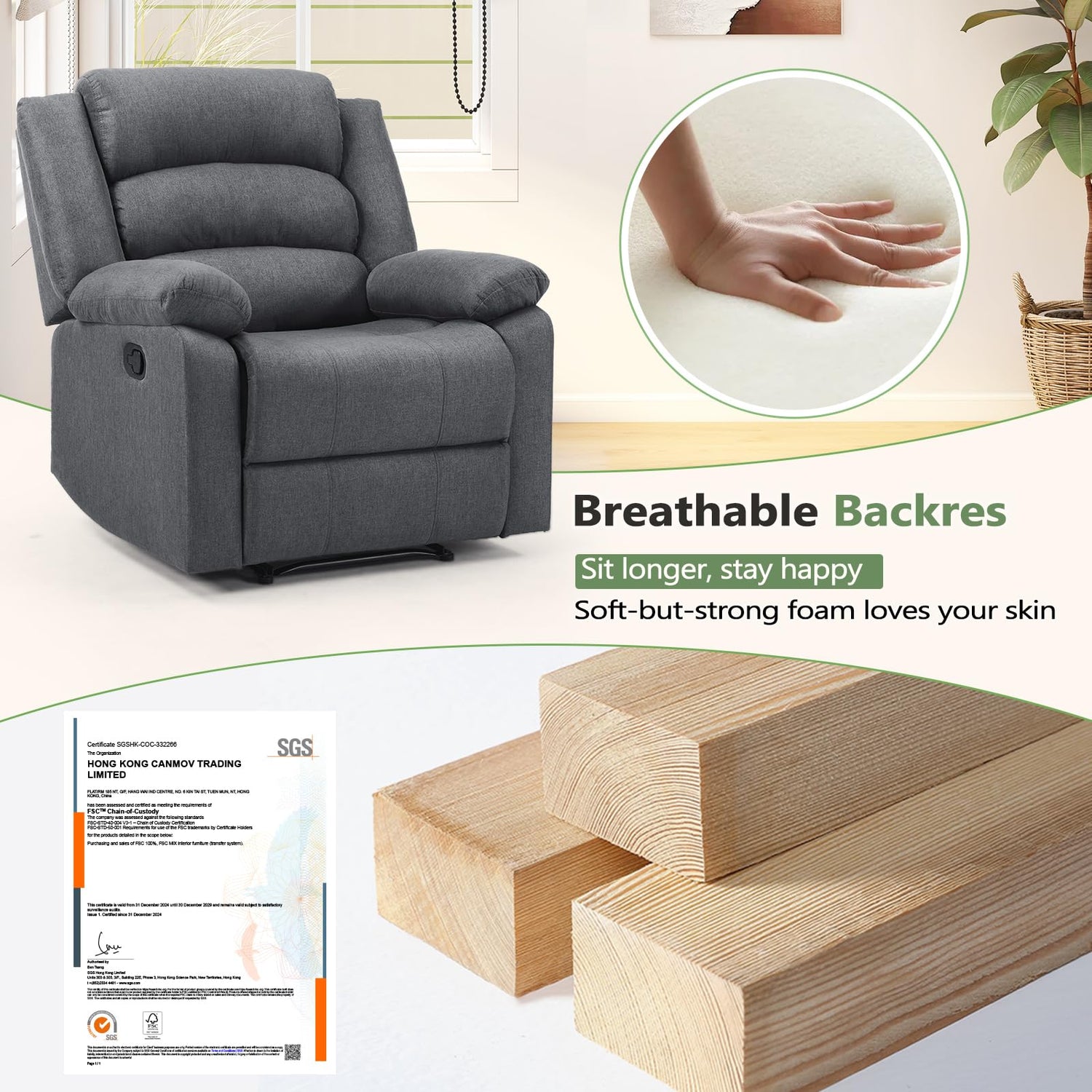 - 【FSC-Certified】:The frame of the recliner chair is made of FSC-certified wood