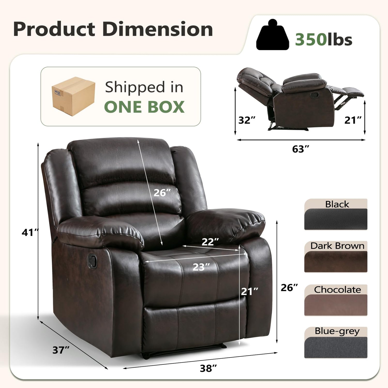 - Easy Assemble & Size: It takes only several steps to assemble this manual recliner chair and NO TOOLS. Overall size: 38"W x 37"D x 41"H, Seat Height – 21", its max weight capacity is about 350lbs.Kindly please confirm the size before buying.