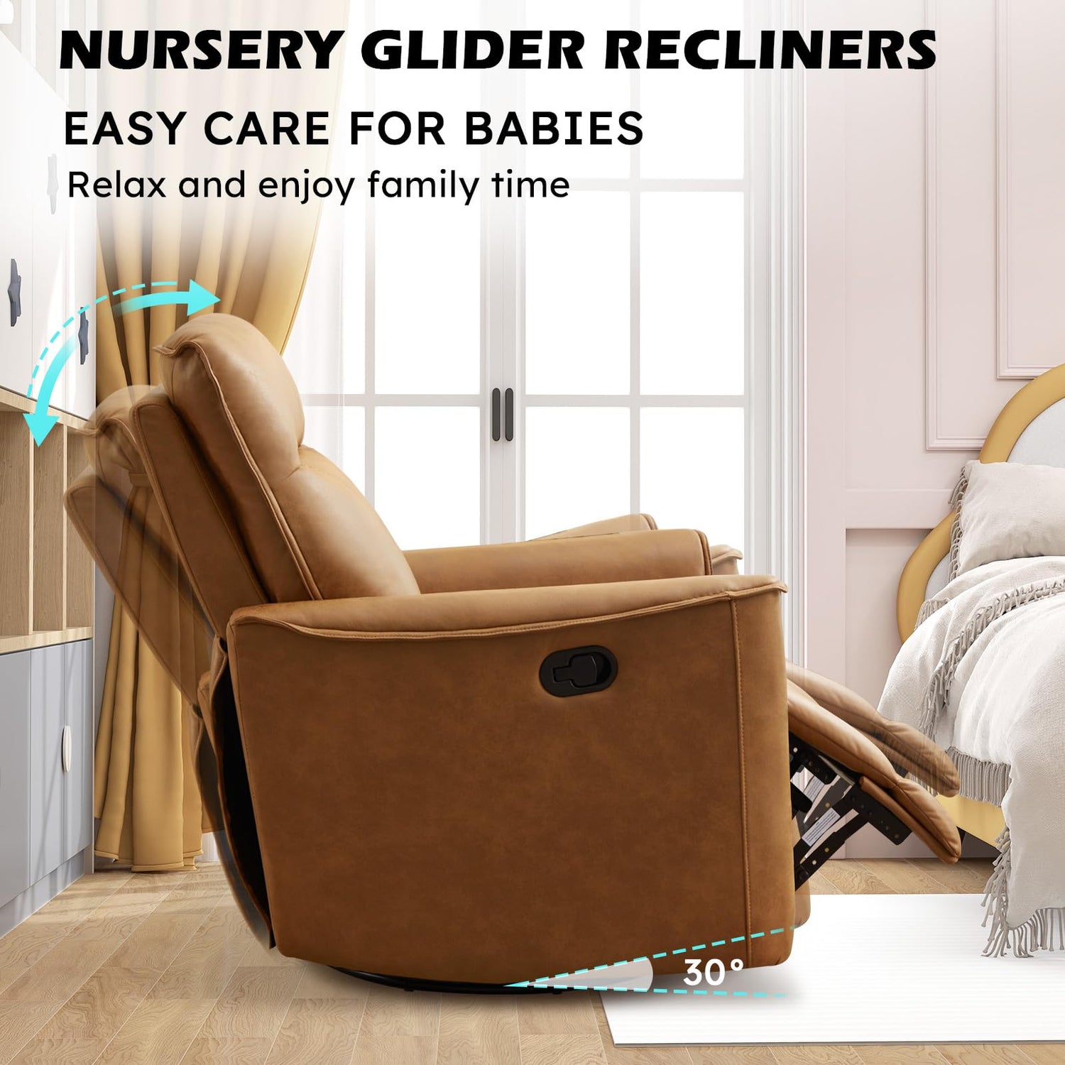 - Swivel Rocking Recliner: Our rocking recliner offers a smooth and gentle 360° swivel, and features a 30° rocking back and forth motion to help your baby fall asleep better and faster. The backrest reclines from 100° to 150°, allowing you to sit and read a book, lean back and watch TV, or recline and relax. The footrest allows you to relax even more while resting