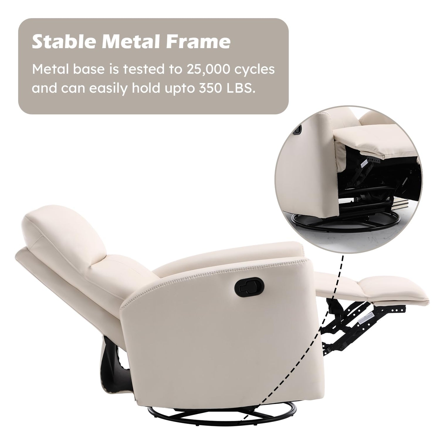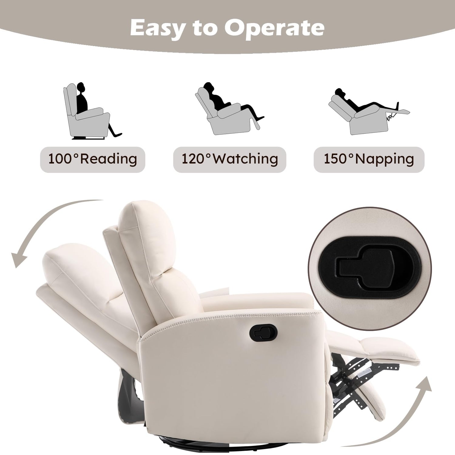 - Swivel Rocking Recliner: With a smooth 360° swivel motion and gentle 30° rocking function, the nursery rocking recliner is perfect for soothing your baby to sleep. Designed with comfort and flexibility in mind, this swivel glider recliner allows you to effortlessly rotate in any direction without repositioning the chair