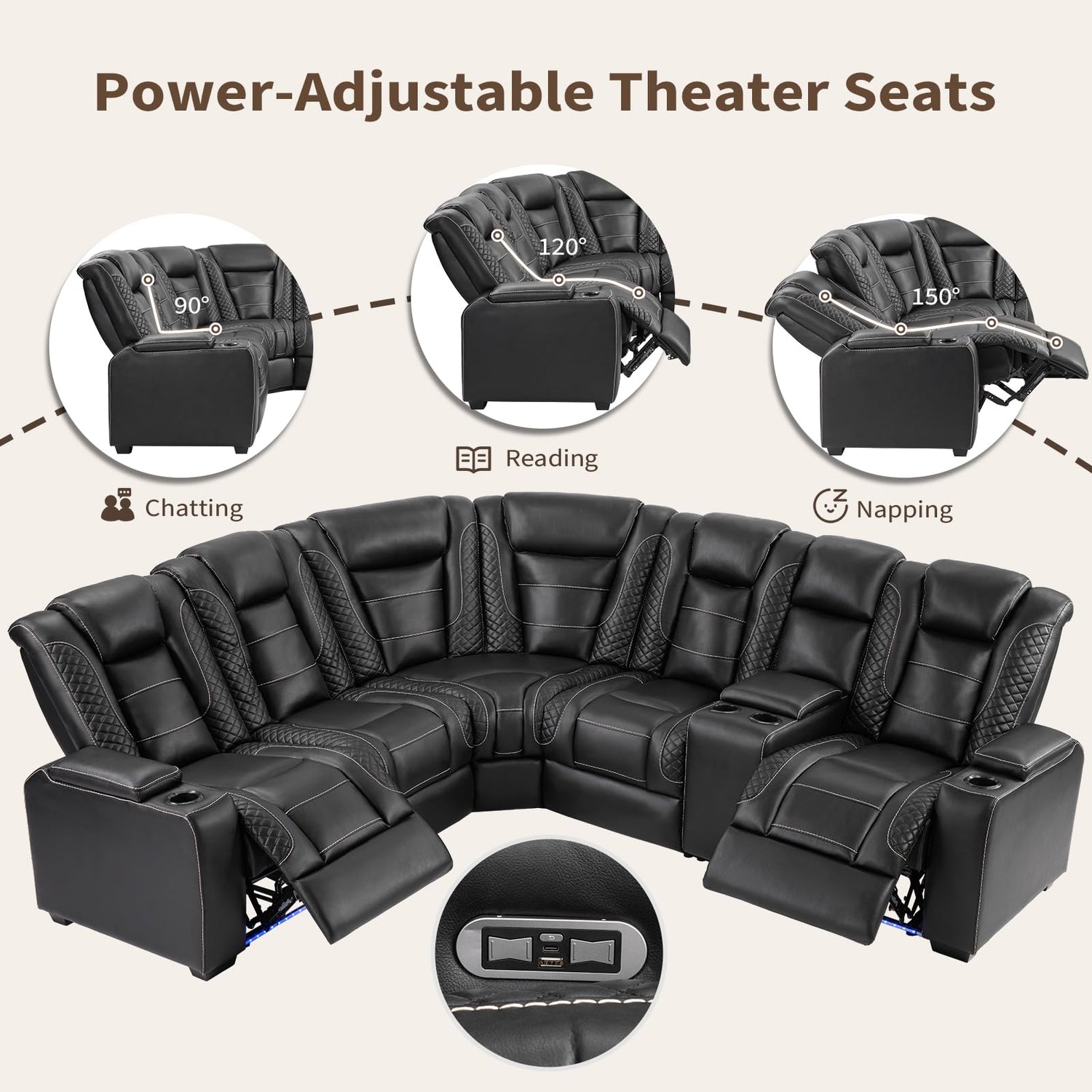 ANJ Modular Power Recliner Set: 5-Seat Home Theater Seating with 2 Loveseats (Center Console & Fixed Middle), LED Lights, USB Charging, Faux Leather for Living Room (Black)