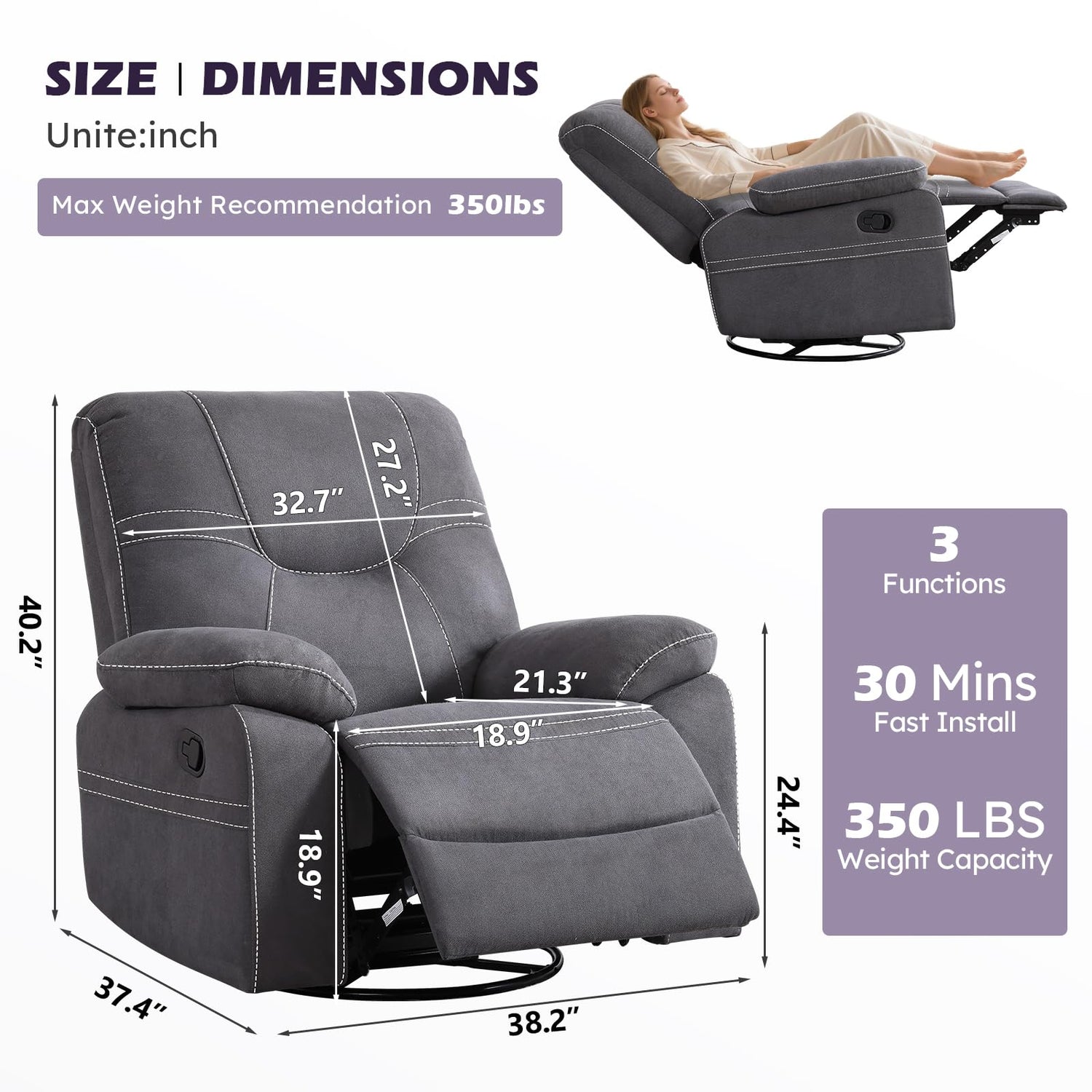 - Swivel & Rocking Recliner: Designed with a 360-degree swivel base, this nursery recliner chair lets you rotate freely in any direction without getting up. The glider recliner also offers a gentle 30° rocking motion that is smooth, quiet, and relaxing