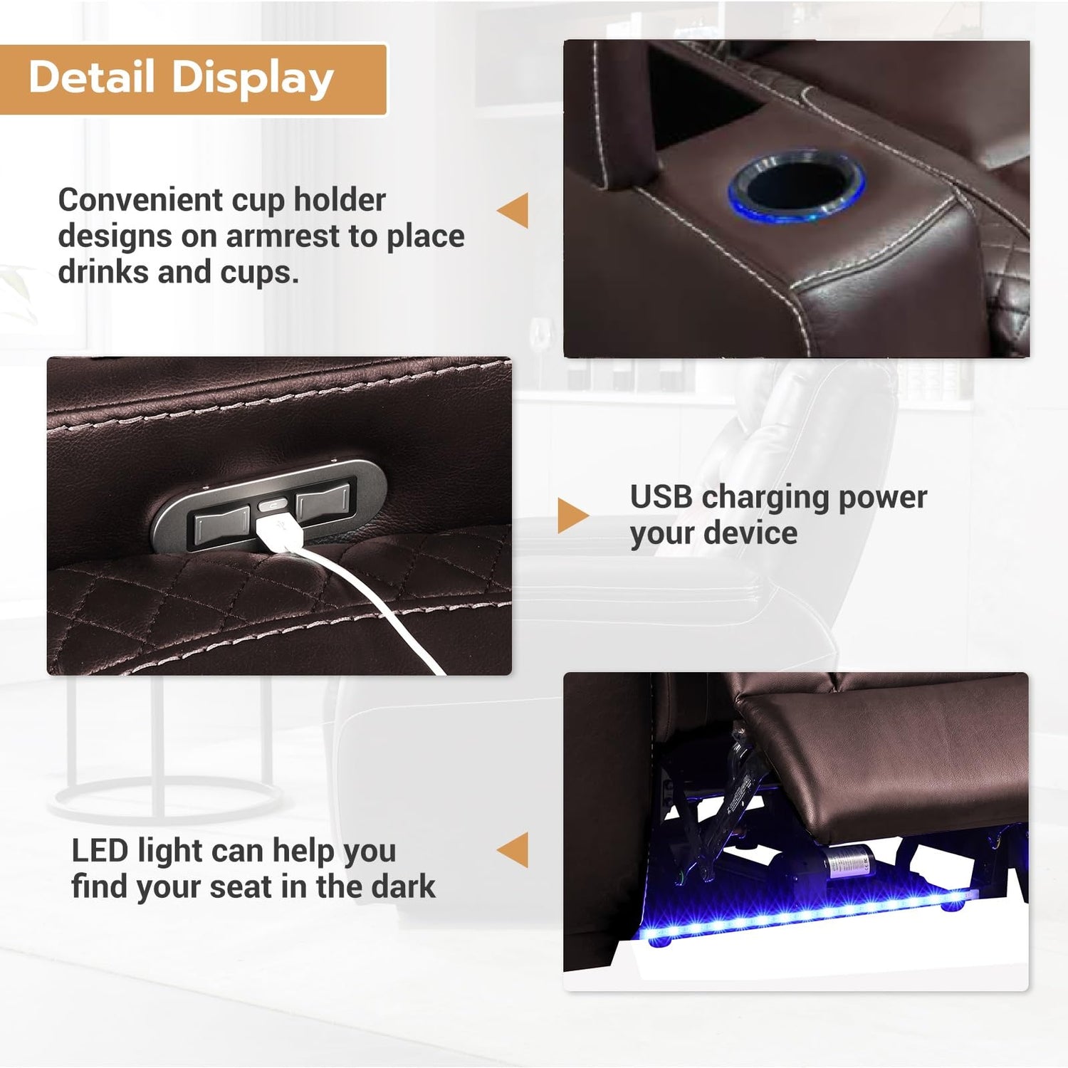 ANJ Power Home Theater Seating Recliner Chairs, PU Leather Recliner with Cup Holder, Electric Movie Theater Reclining Chairs with Adjustable Powered Headrest, LED Lights, Hidden Arm Storage (Brown)