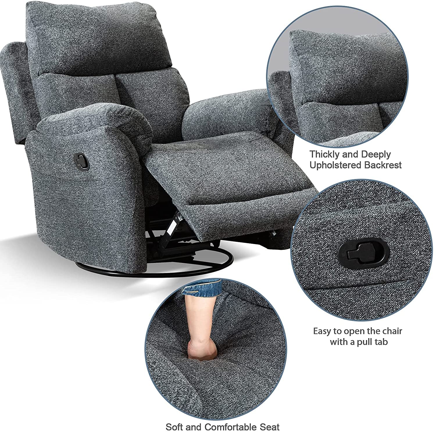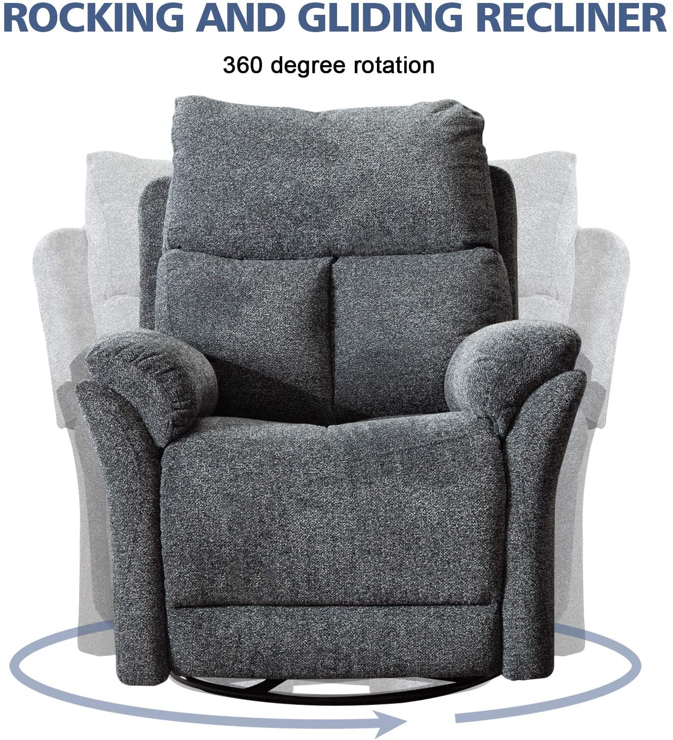 - Modern Design: This manual swivel rocker gliding recliner chair with thickness cushions and armrest, with soft curves, this chair is not only comfortable and soft but is also beautifully designed. NOTE! The backrest will retract as the body moves