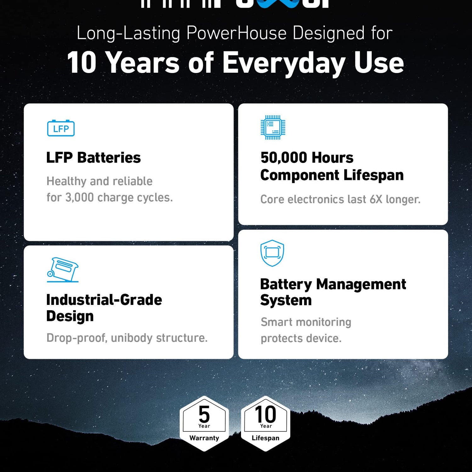 - Long-Lasting Portable Power Station With a 10-Year Lifespan: With our proprietary long-lasting technology InfiniPower™, combined with LiFePO4 batteries, ultra-durable electronic components, a smart temperature control system that monitors temperature up to 100 times per second, and impact-resistant structural design, Anker Expansion Battery 760 is built to last over a decade, even with everyday use.