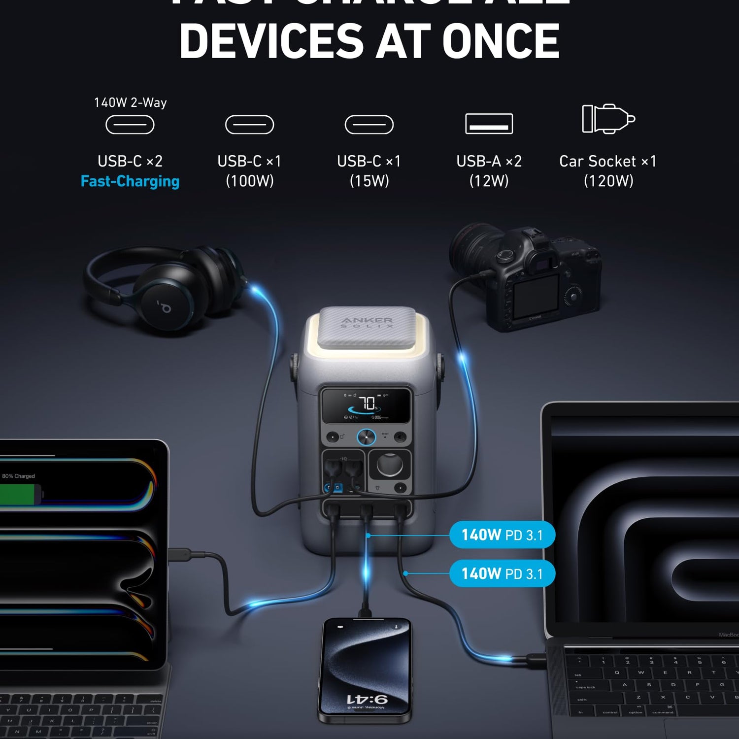 - 7 Device Charging Ports: Power all your tech with versatile ports, including 1× car socket (120W), 2× USB-C (140W), 1× USB-C (100W), 1× USB-C (15W), and 2× USB-A (12W).