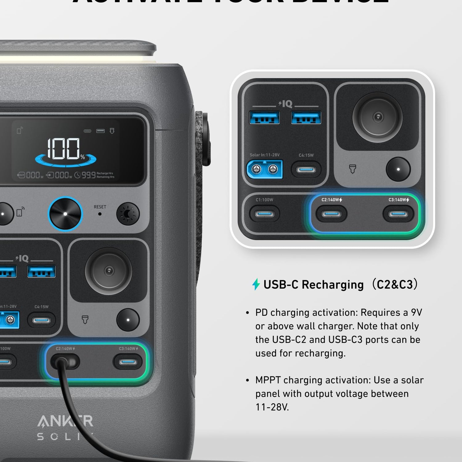 - Solar-Powered Escapes: When your journey needs endless charging, do so seamlessly and sustainably with a 100W solar panel. We recommend 100W or 60W Anker Solar Panel. This power station is not compatible with Anker SOLIX PS30 (or other 5V~3A USB-C panels), PS200, PS400.
