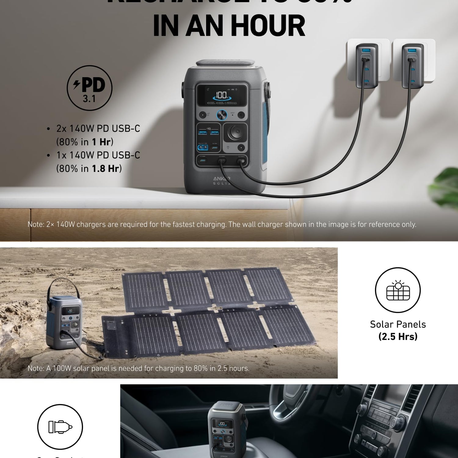 - Your Choice of Recharging: Fast Recharge to 80% in an hour with the dual PD 3.1 USB-C port, or use solar panels or your car. Stay charged, no matter where you are.