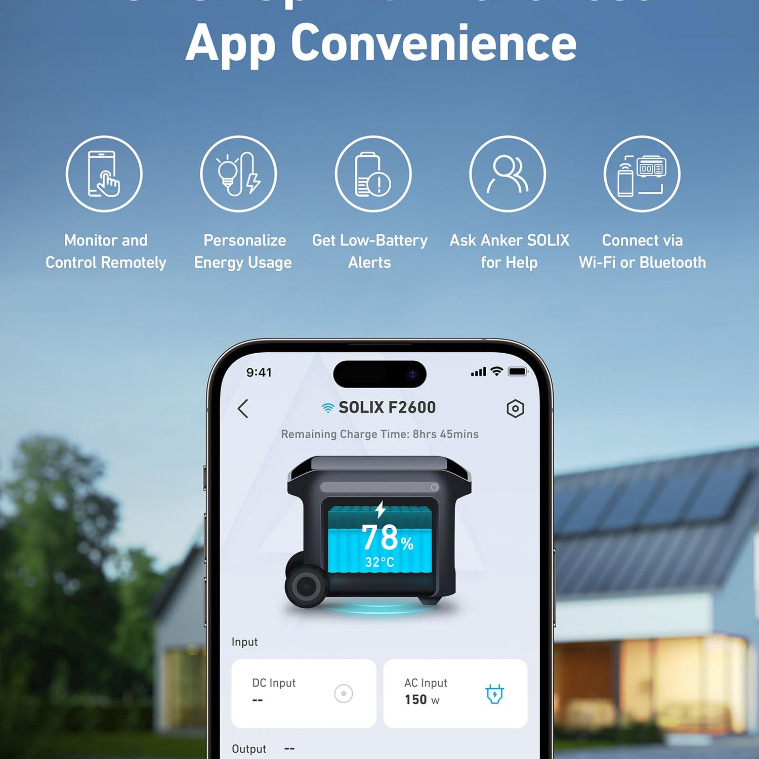 - Control Your Power with the Anker App: Put power in your hands with the Anker app and control Anker SOLIX F2600 via Bluetooth or Wi-Fi. You also get low-battery alerts and can customize discharge limits, recharging speed, and more.