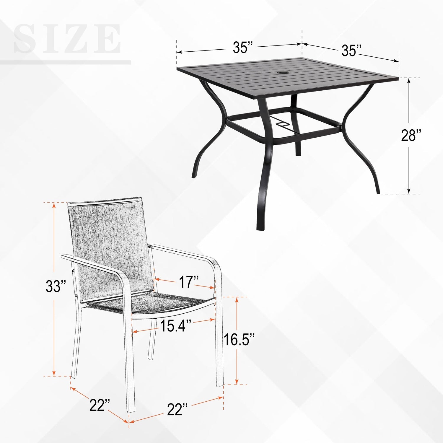 - COMPLETE SET: 5-piece patio dining set includes a 35-inch square table with umbrella hole and 4 matching stackable chairs with gray sling fabric seating