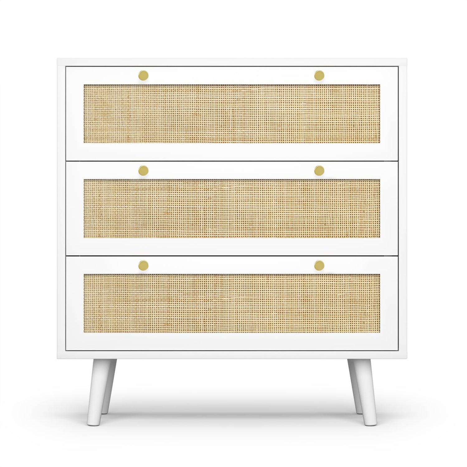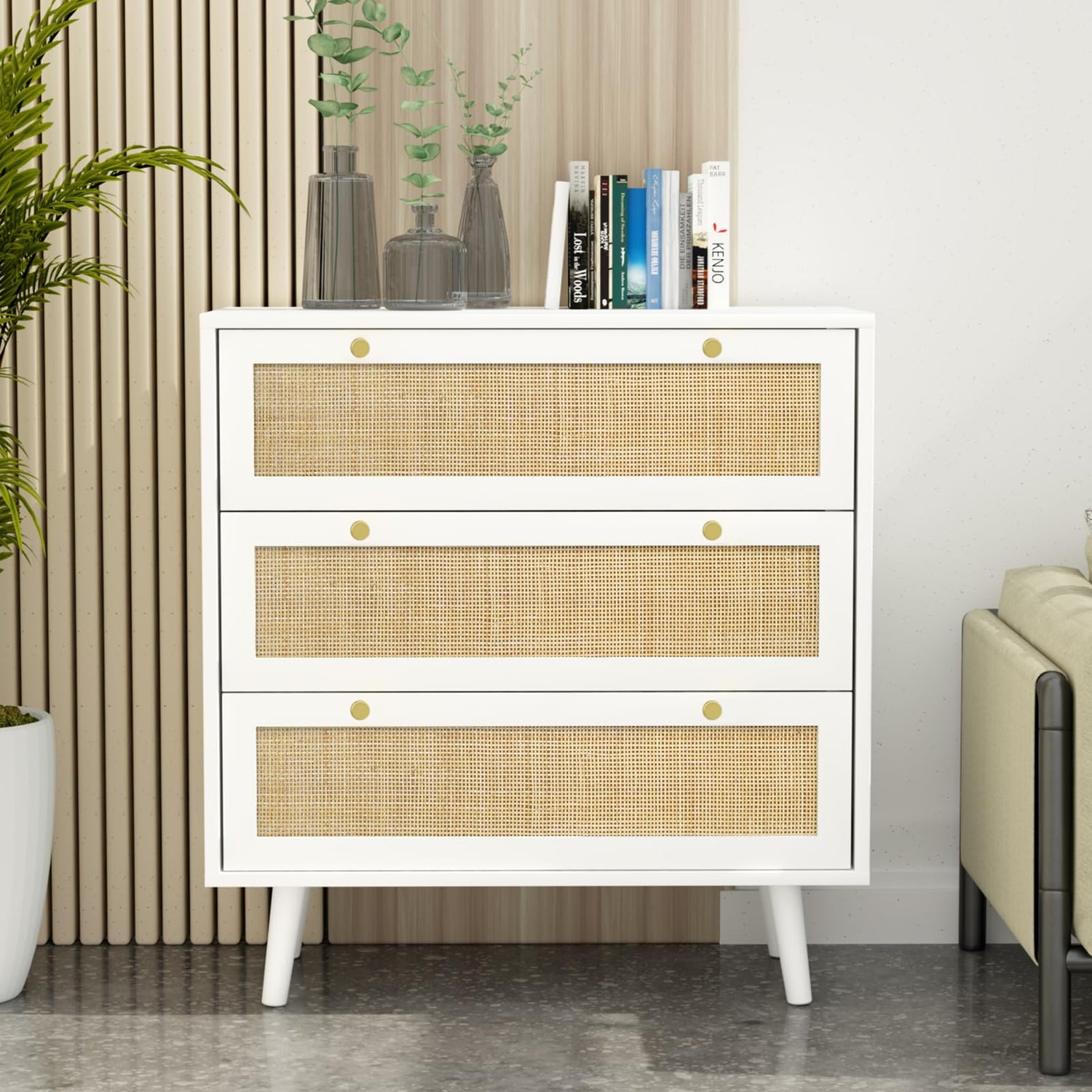 Anmytek Dresser for Bedroom with 3 Drawers, Modern Wood 3 Drawer Dresser, White Chest of Drawer with Spacious Storage Rattan Dresser for Bedroom Living Room H0072
