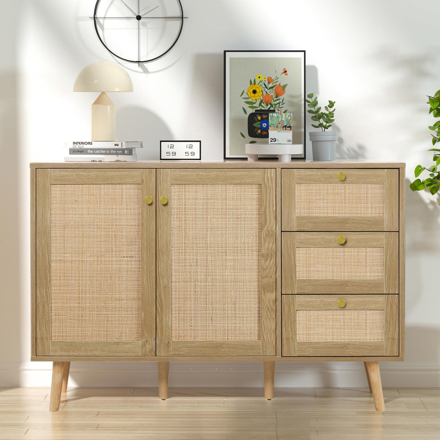 - ⭐Quality Material: Made of well-selected particle board and exquisite natural rattan, the buffet cabinet is well-constructed and durable. Five wood tapered legs ensures the stability of the cabinet, no worry of wobble or unstable.