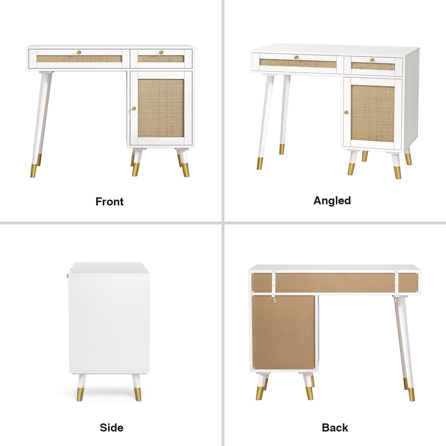 Anmytek Rattan Vanity Desk with Drawers and Storage, White Makeup Vanity Table Modern Home Office Desk Computer Desk for Study D0006