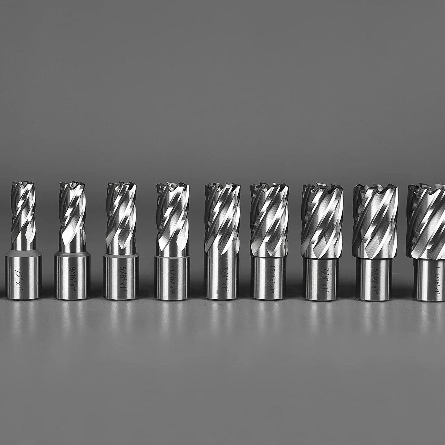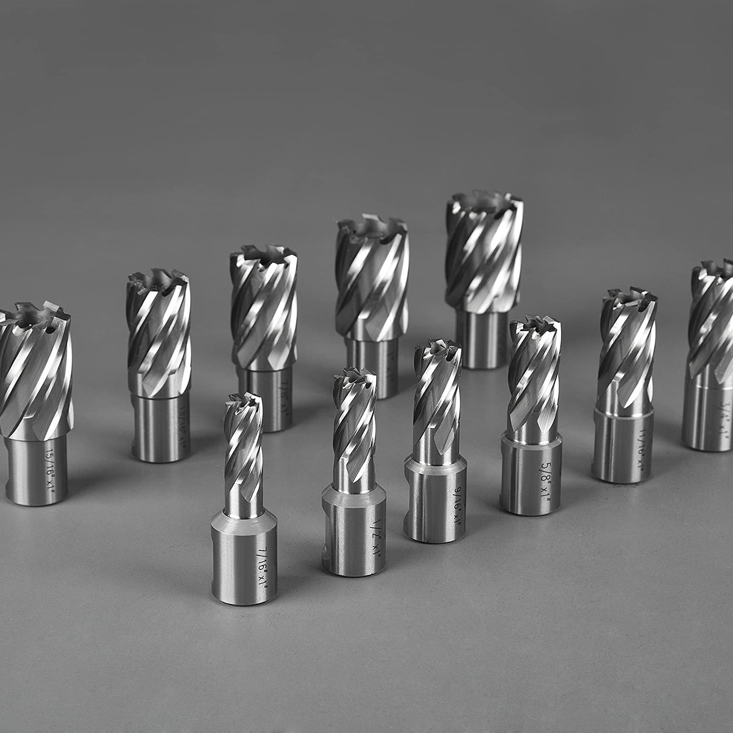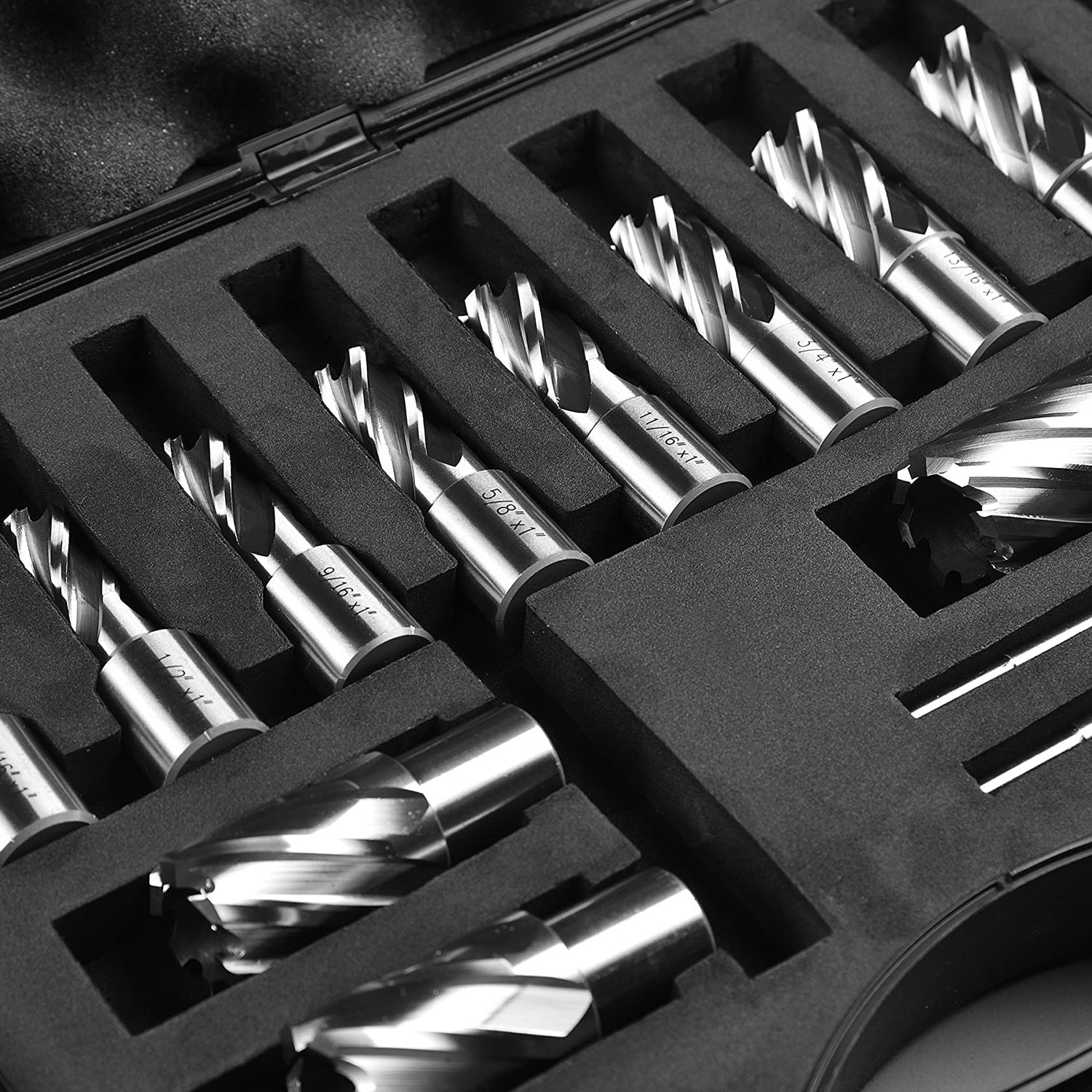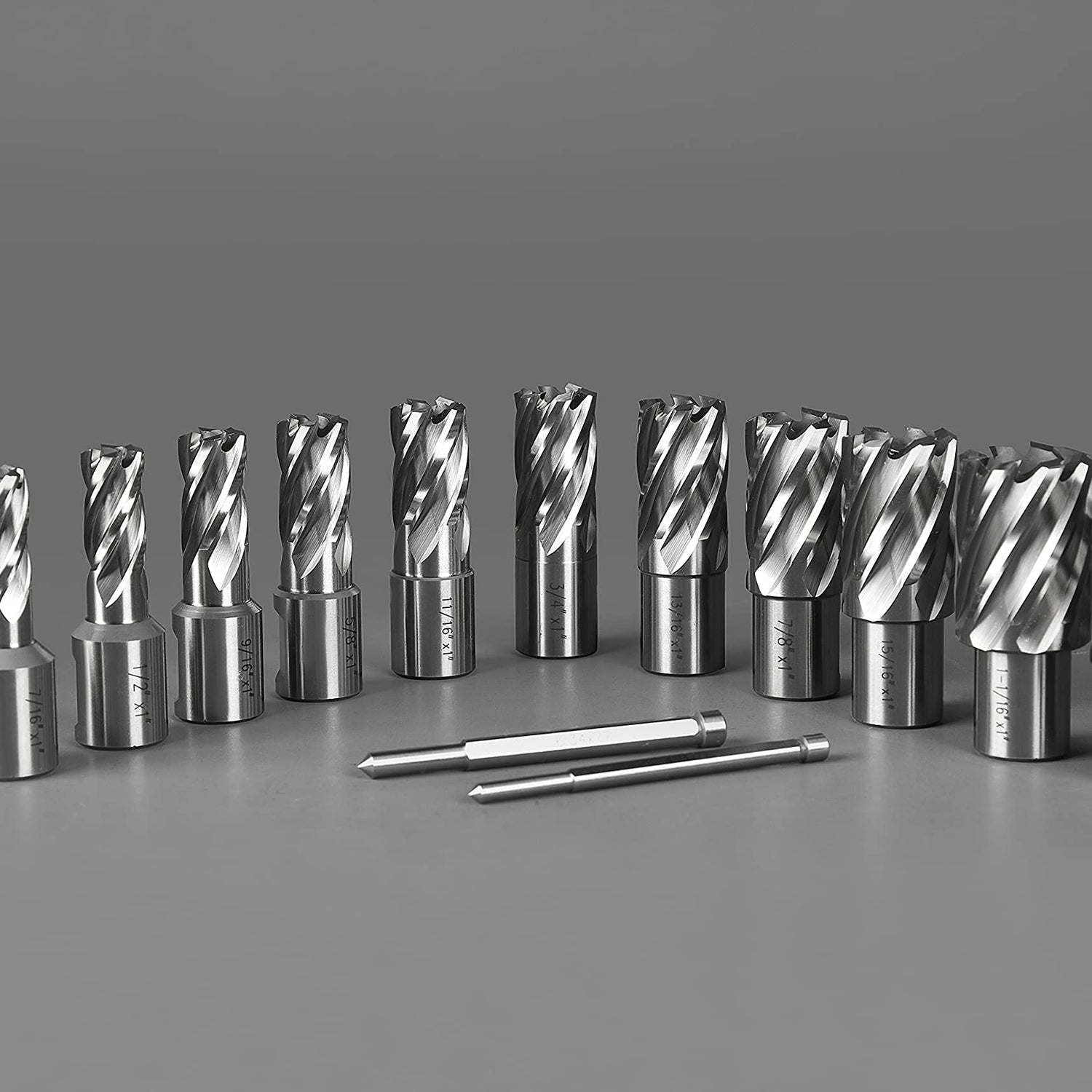 Annular Cutter Set 13 pcs JESTUOUS 3/4 Inch Weldon Shank 1 Cutting Depth and Cutting Diameter from 7/16 to 1-1/16 for Mag Drill Press HSS Standard Kit Two Flat with 2 Pilot Pins