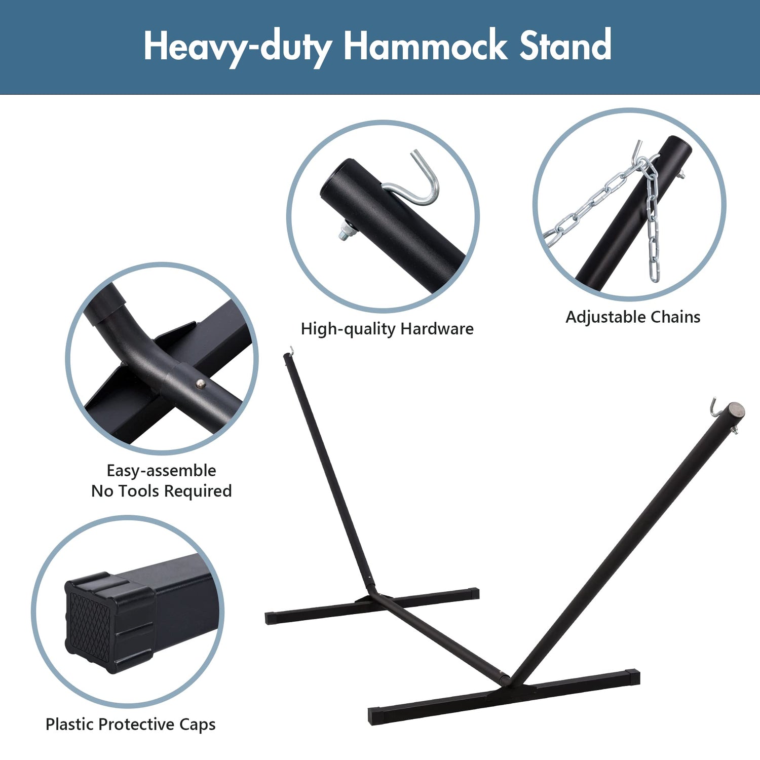 - STEEL STAND FOR HAMMOCKS: Hammock stand is made of heavy-duty gauge steel, featuring safe, durable and weather resistant. It can be easily assembled in minutes without any tools. Including a magazine bag and a cup holder, this 12 ft hammock with stand included is very suitable for reading, relaxing, and resting in the garden, terrace, backyard, poolside or balcony