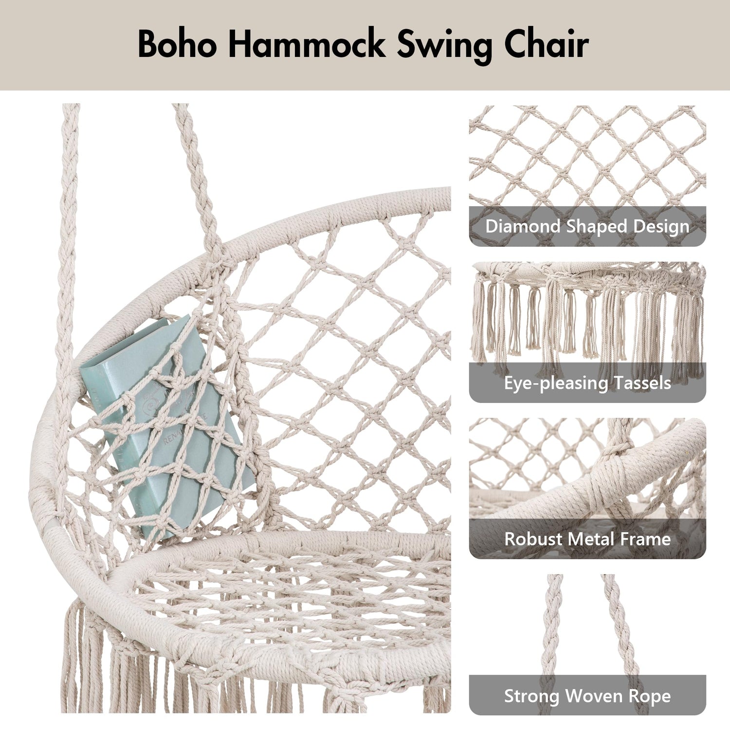 - DURABLE & COMFY: This strong swinging chair is made of tightly woven cotton ropes and a double-reinforced seat. Tassels design increases the beauty and practicality of hammock chair. A large and thick cushion supports your back, arms, and legs, embraces you with ultimate softness, takes away your fatigue