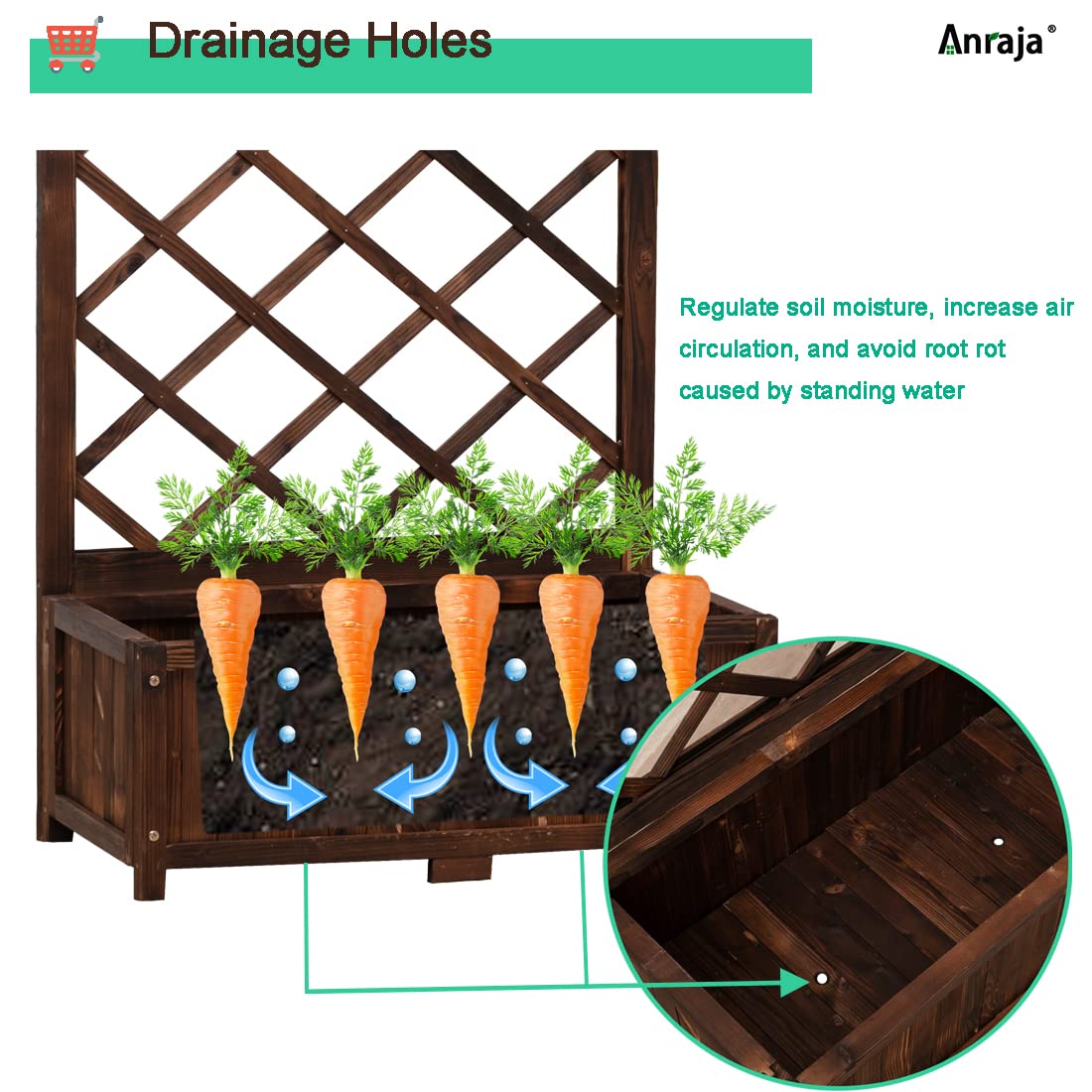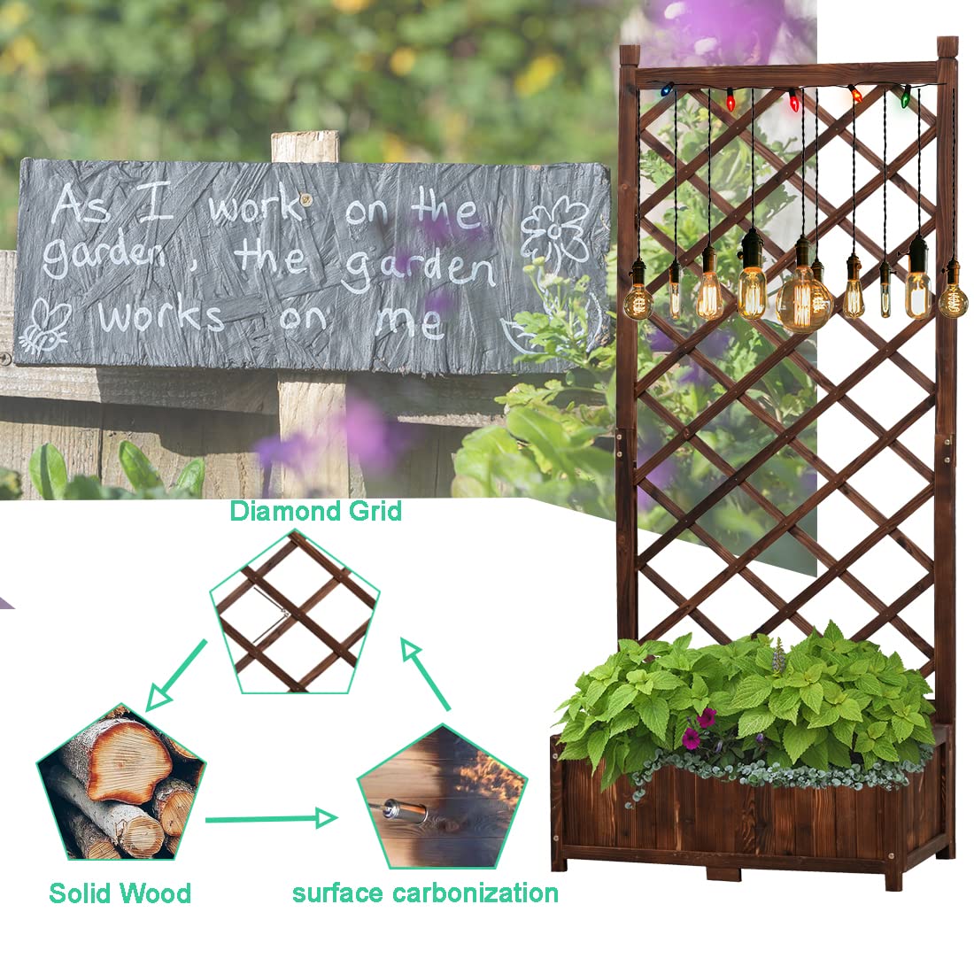 Details: 53.7'' Tall Trellis Large Flower Box 100% Solid Wood The free standing planter with lattice will add a touch of charm to any outdoor space.It has a large flower planter which can accommodate a large number of green plants and flowers, you and your family put soil into it and plant vegetable, herb or tomato, they also provide enough room for climbing plants. It will provide ample privacy once something is growing on the trellis, and be perfect for covering up the AC & hiding hose reel.The planter with panel is easy to put together. There are some drainage holes in the bottom tray, the water was able to drain out better. Pack List: -Flower stand *1 set -Hardware *1 set
