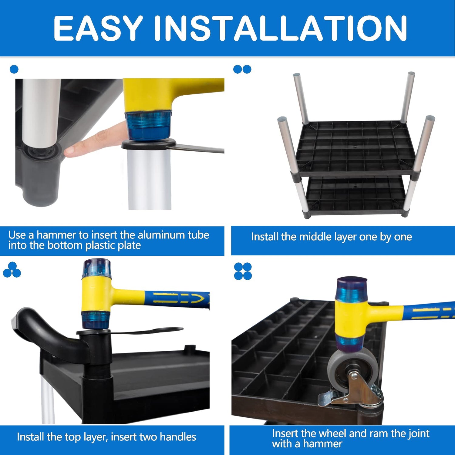 Details: About usOur founder was originally an ordinary worker who has been working on the front line for many years. He knows that a cart with good performance can improve work efficiency and reduce burden. In order to obtain a high-quality and practical utility cart, a company that can provide life-use carts was established, named ANRYAGF. The main goal is to provide a series of excellent carts for every employee or other people who need carts. Really work easily and live happily.Why choose us?Excellent performance: high-quality and lightweight aluminum tubes, high-density plastic laminates and super smooth rubber silent wheels can make your work easier and more comfortable.Installation is simple: just insert the aluminum tube into the laminate according to the requirements, we also have a free cushion, you can use a rubber hammer to assist in the installation of the trolley.Large capacity: The size is 31.5"l X 16.9"w X 37.8"h, maximum load-bearing capacity of 390 pounds.