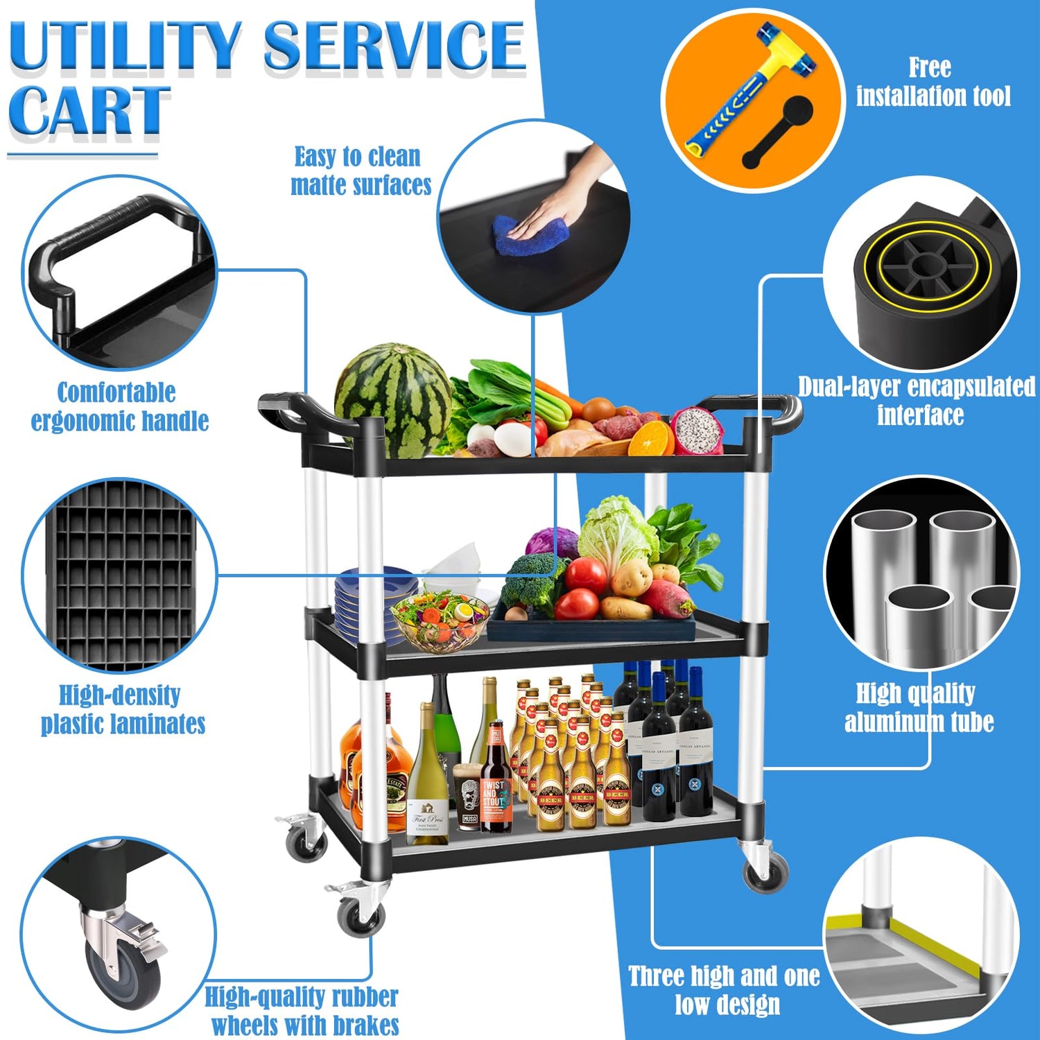 ANRYAGF Utility Carts with Wheels, 3 Tier Rolling Cart with Wheels, Kitchen Food Cart on Wheels, Heavy Duty Cart 510 lbs Capacity, Lockable Wheels, Rubber Hammer, 16.9" D x 31.5" W x 39.5" H