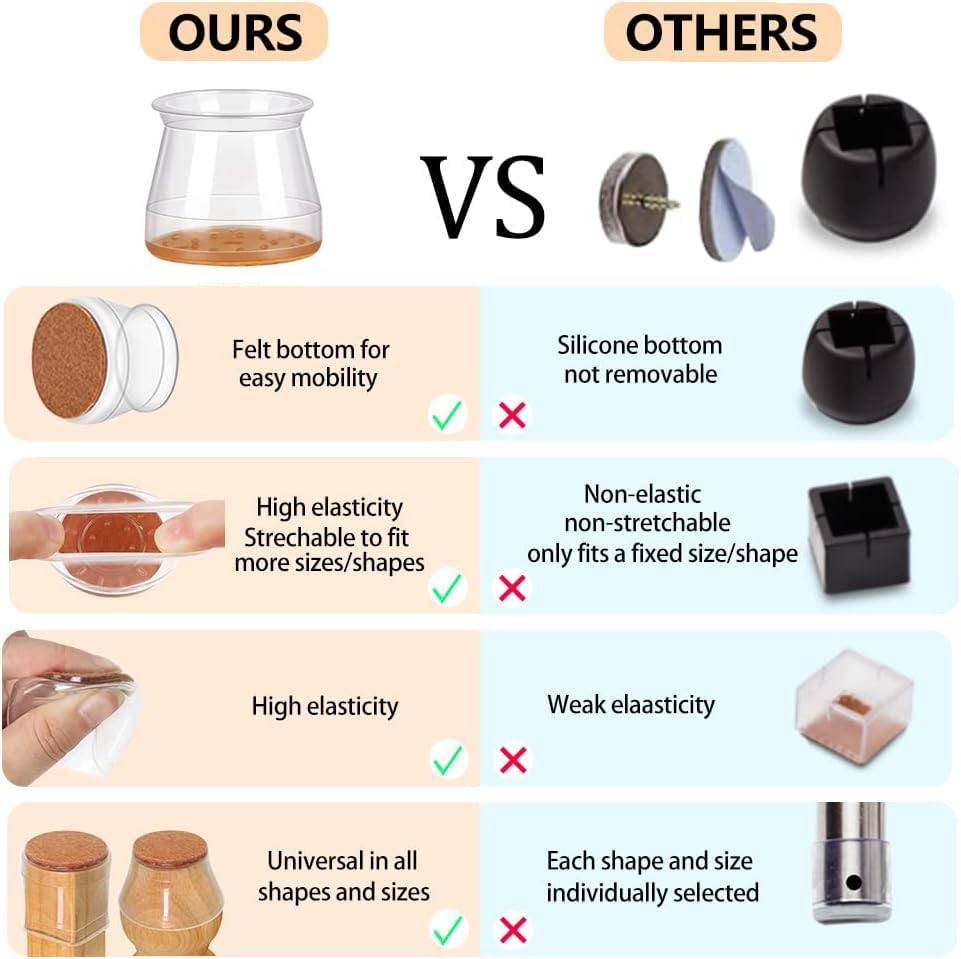- Easy to Install: These protectors are easy to install and can be fitted to your chair legs in just a few seconds. Simply slip the protectors over the legs and they will stay securely in place, protecting your floors and reducing noise.