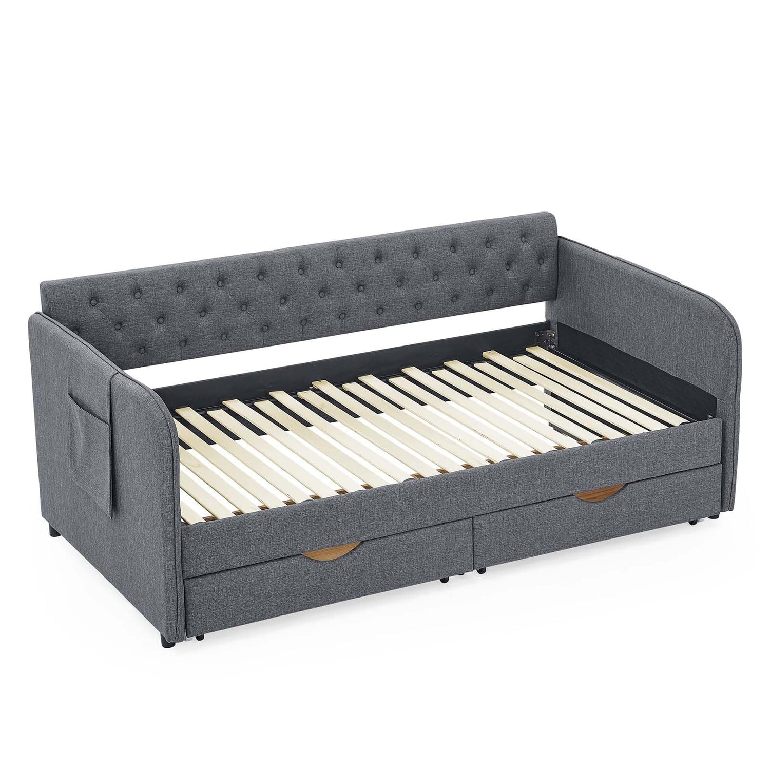 - Daybed with Storage: There is 2 large drawers under the storage sofa bed to store your bedding and clothing, which is an excellent solution to clutter. On the side of the armrest are storage pockets, which are a good place to store magazines, phones, and iPads, keeping everything close at hand