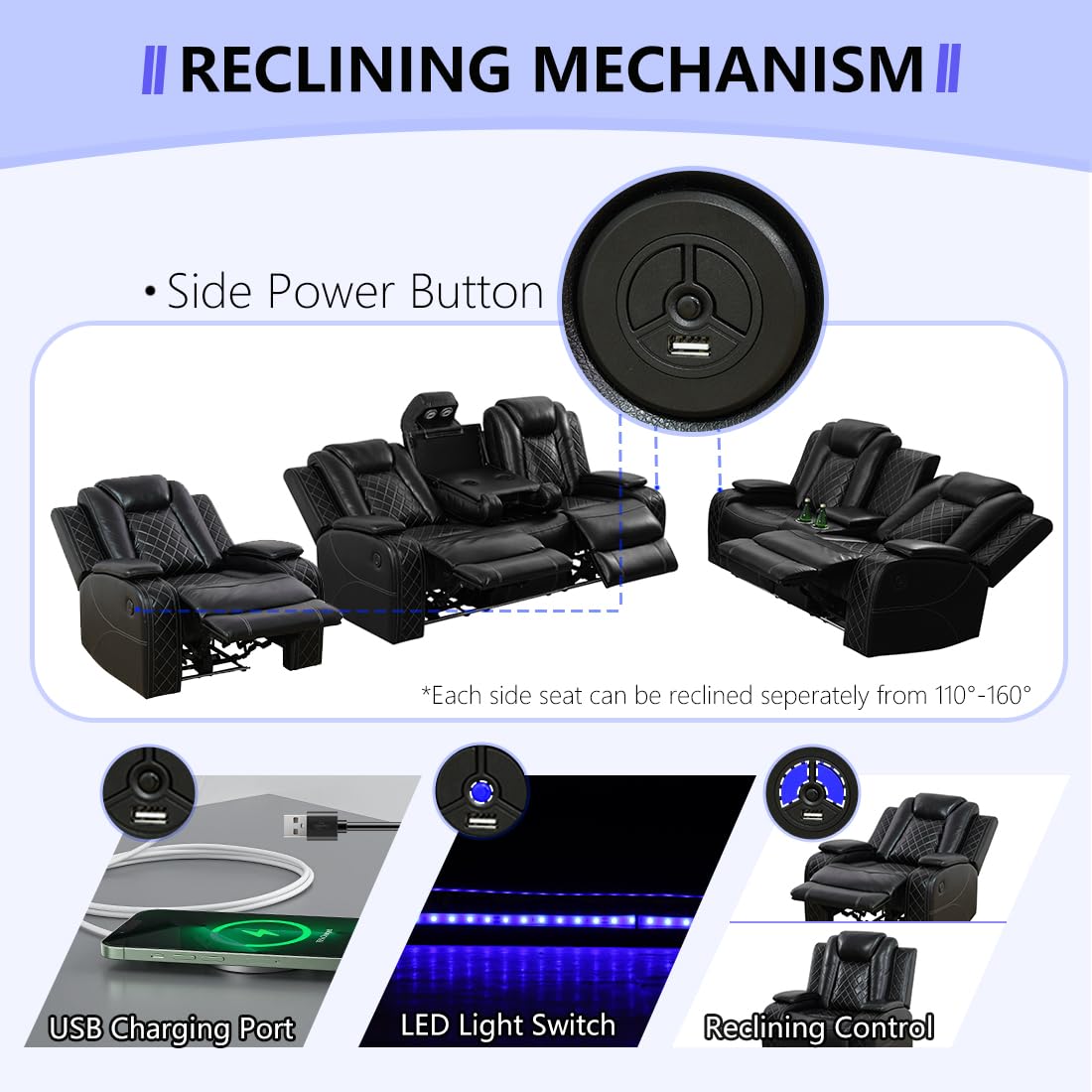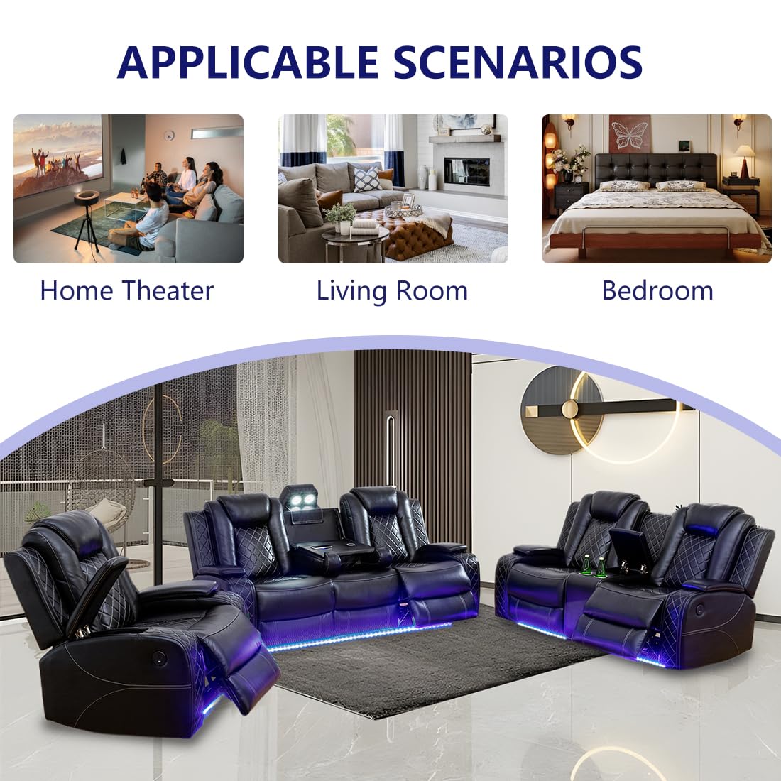 Anthato Black Leather Power Recliner Set with LED Lights, 3-Piece Recliner Sofa Loveseat Chair with Coffee Table/Storage/Charging Port, Modern Reclining Furniture for Living Room/Home Theater/Office