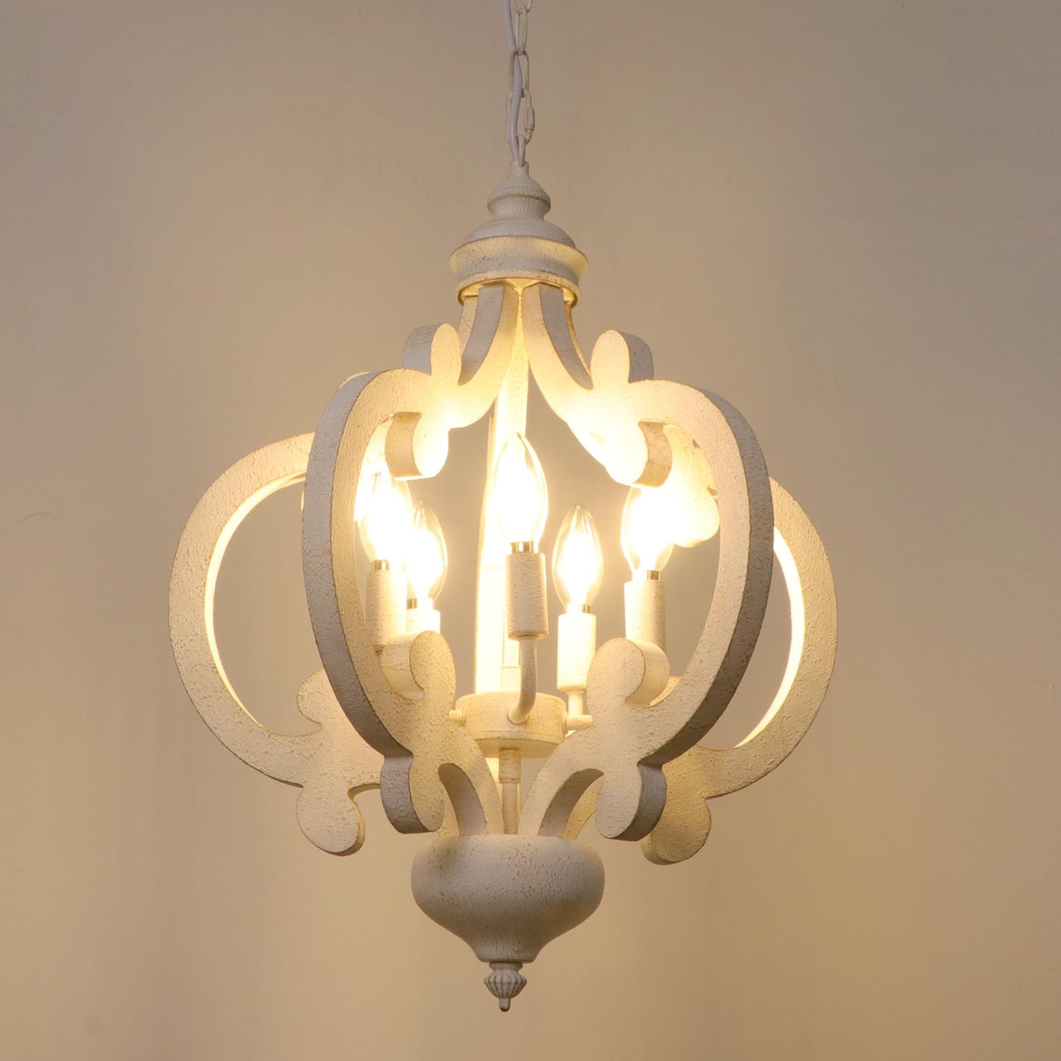Antique White Farmhouse Chandelier Rustic Wood Pendant Light, 5 Lights 17 Inch French Country Chandelier Cottage Orb Chandeliers Hanging for Dining Room Kitchen Island Bedroom Foyer