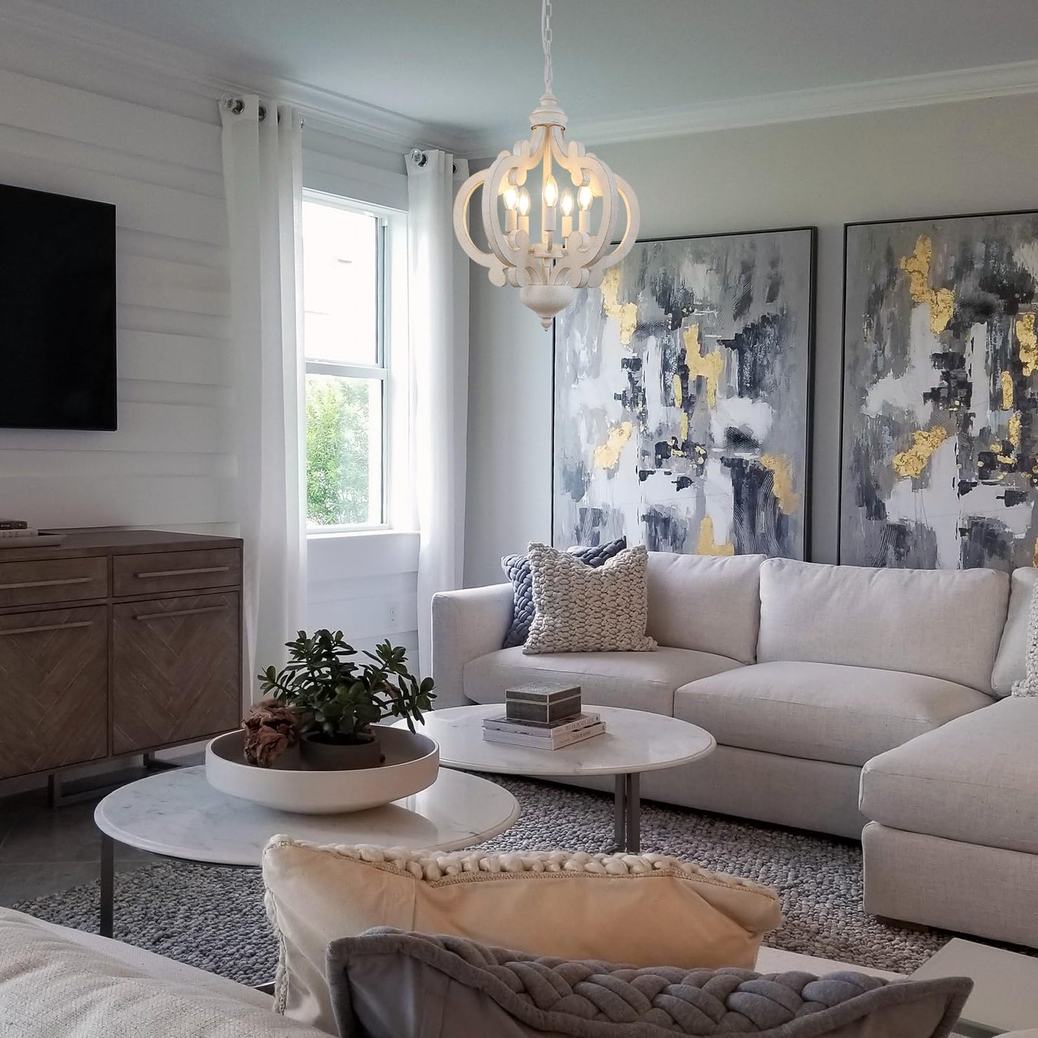 - Farmhouse Wood Chandelier: This 5-light farmhouse chandelier features a solid wood frame and metal candle-shaped lamp holder, with distressed white finish design to create a rustic chic look, adding french country accent to your home.