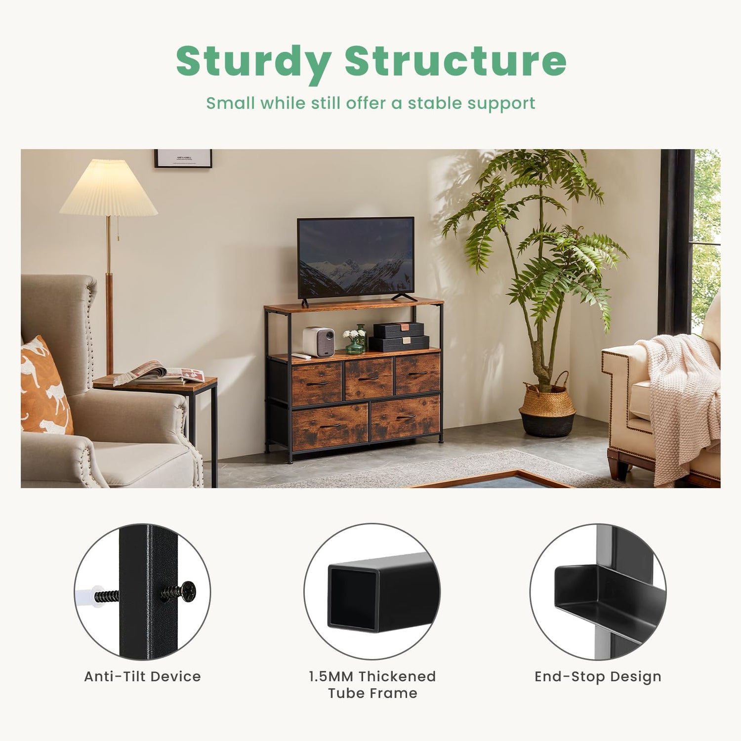 ANTONIA TV Stand Dresser for Bedroom with 5 Fabric Drawer, Entertainment Center for 45 inch Television, Media Console Table with Storage, Open Shelf, Adjustable Feet, Living Room Furniture, Brown