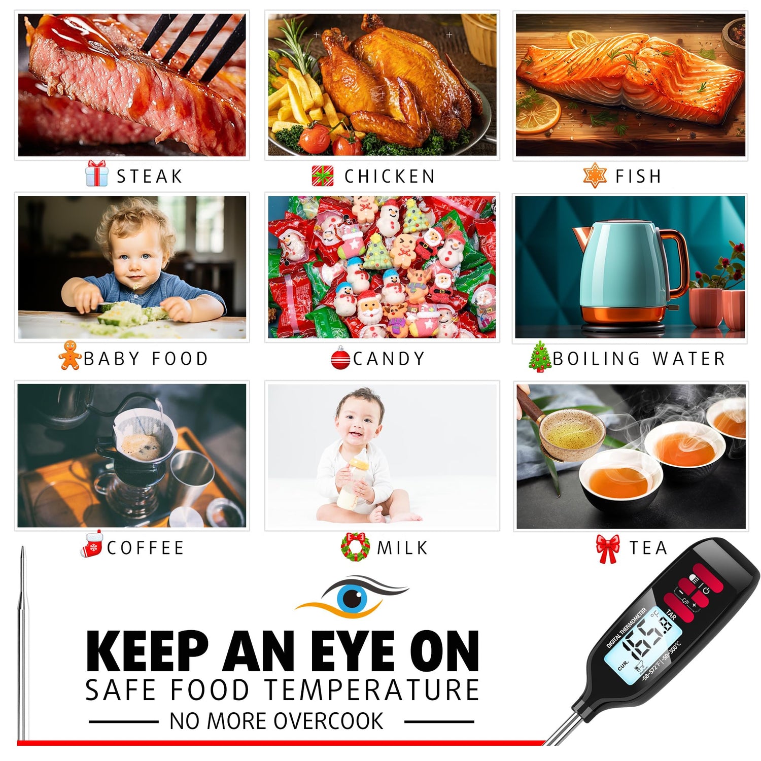 - This instant read digital meat thermometer helps to read the internal temperature of your steak, chicken, fish and milk in 2 seconds. You know how is the temperature of your food accurately, and keep it safe & delicious. No more overcook